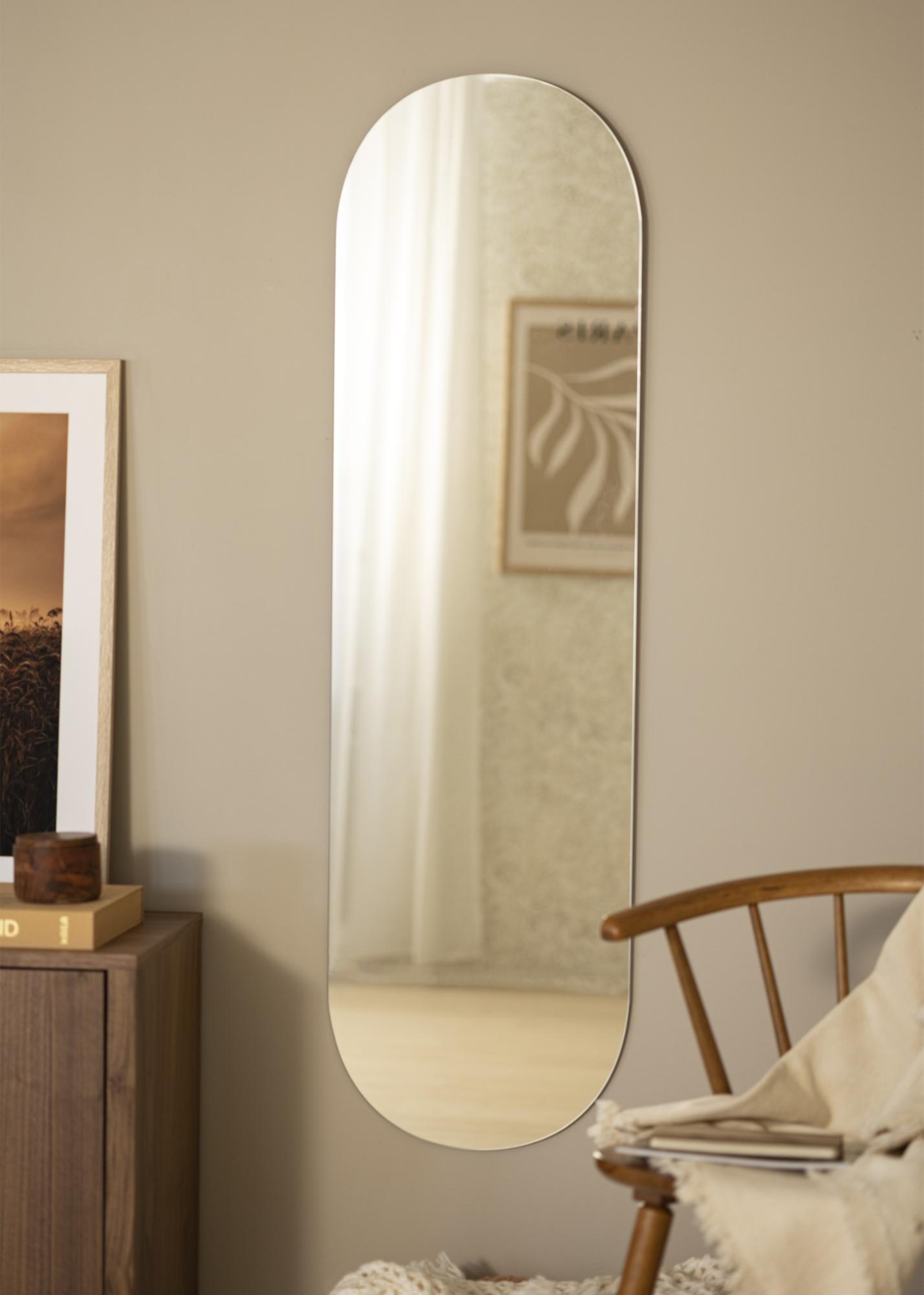 Oppdag den elegante og allsidige veggspeilet som er designet for å komplementere alle rom i hjemmet ditt. Med sine generøse mål på 40x140 cm, tilbyr dette speilet en praktisk og dekorativ funksjon i din plass. Dens organiske og langstrakte form med avrundede kanter og en myk bøy på toppen gir et moderne og mykt utseende som smelter sammen med forskjellige interiørstiler.