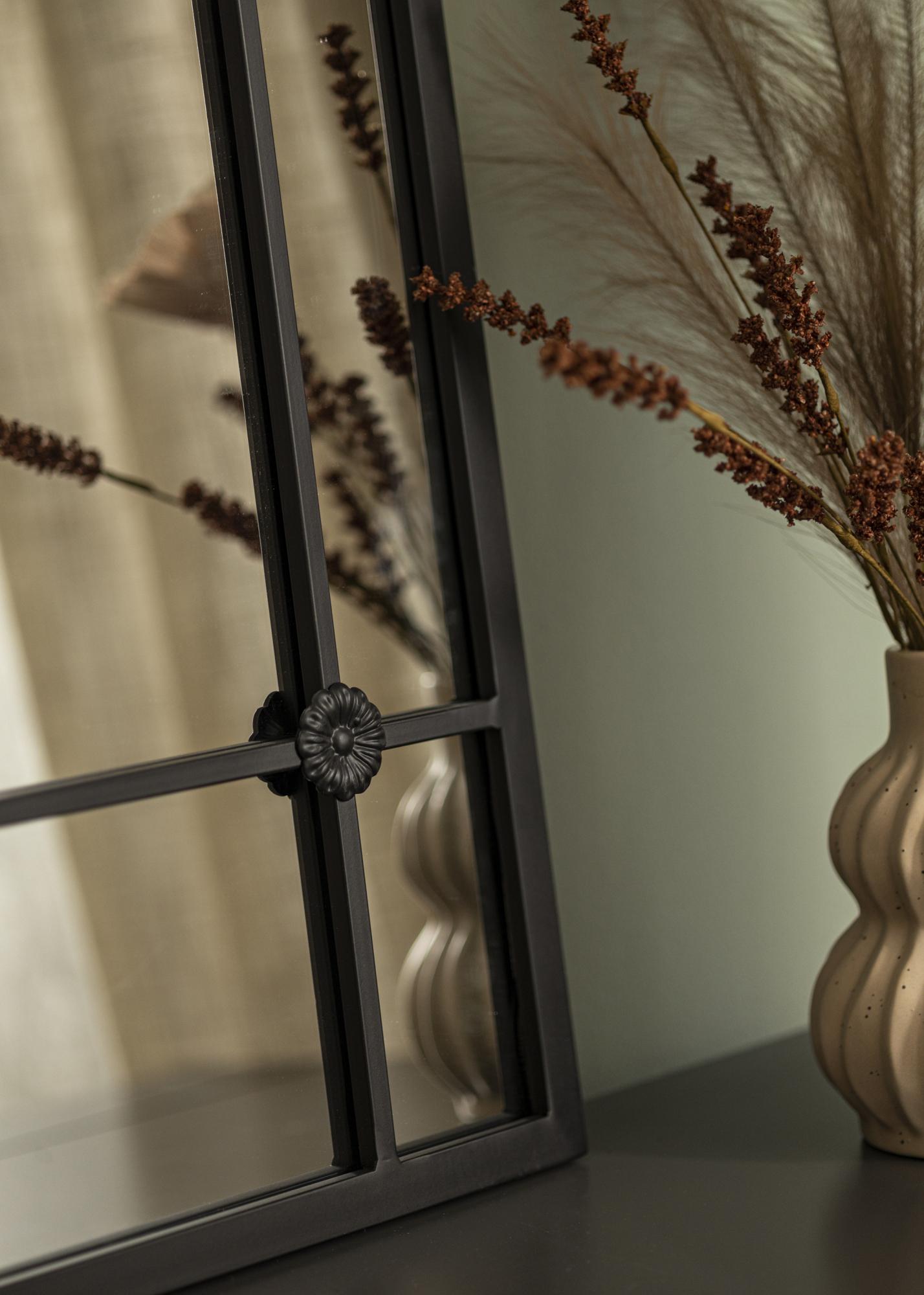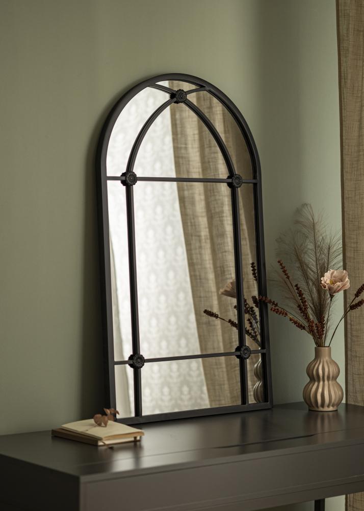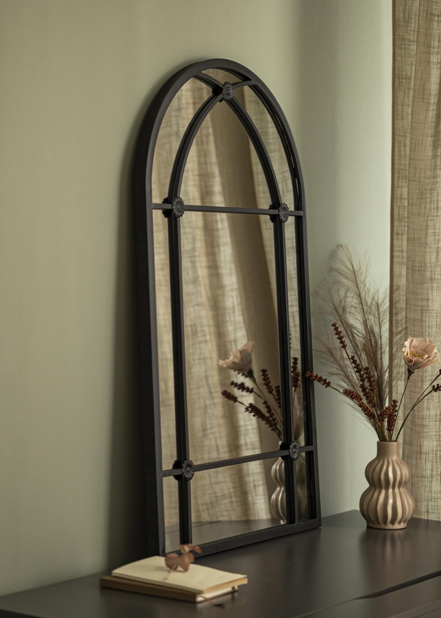 Med sin buede silhuett og detaljerte jernarbeid, minner speilet om klassiske vinduer som gir en følelse av dybde og rom i rommet. Det er ikke bare en praktisk gjenstand for daglig bruk, men også en kunstnerisk innredningsdetalj som fanger blikket og bidrar til atmosfæren i rommet.