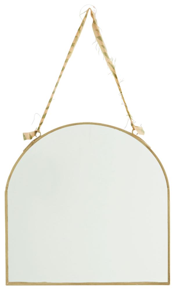 Bueformet speil fra Madam Stoltz, med ramme i messingfarge. Speilet henges opp i et bomullsbånd. Det gir et bohemsk uttrykk som passer utmerket både i stuen og på soverommet. Veggspeilet måler 23x23 cm. Den nette størrelsen gjør at veggspeilet er superfint sammen med andre speilmodeller.