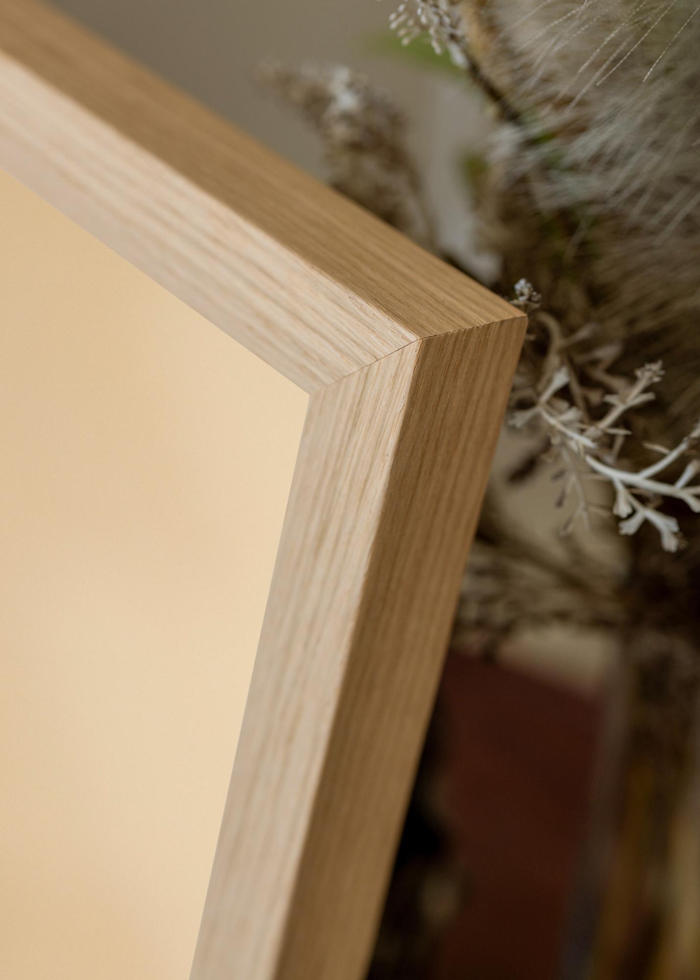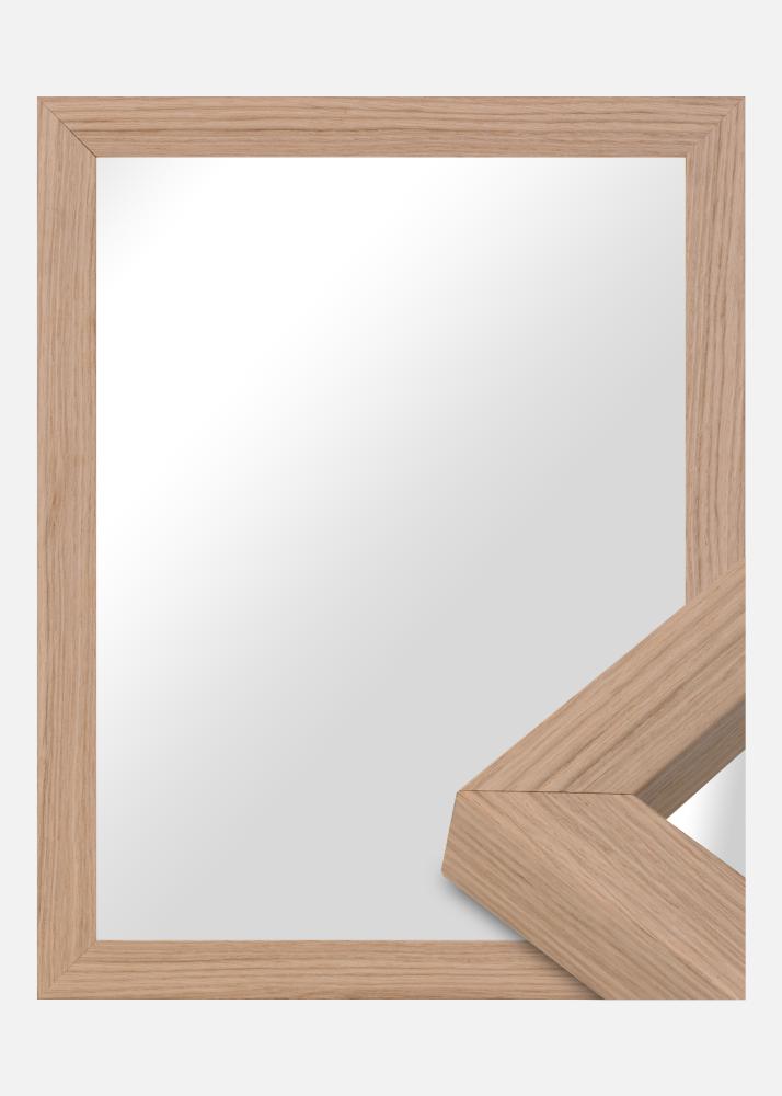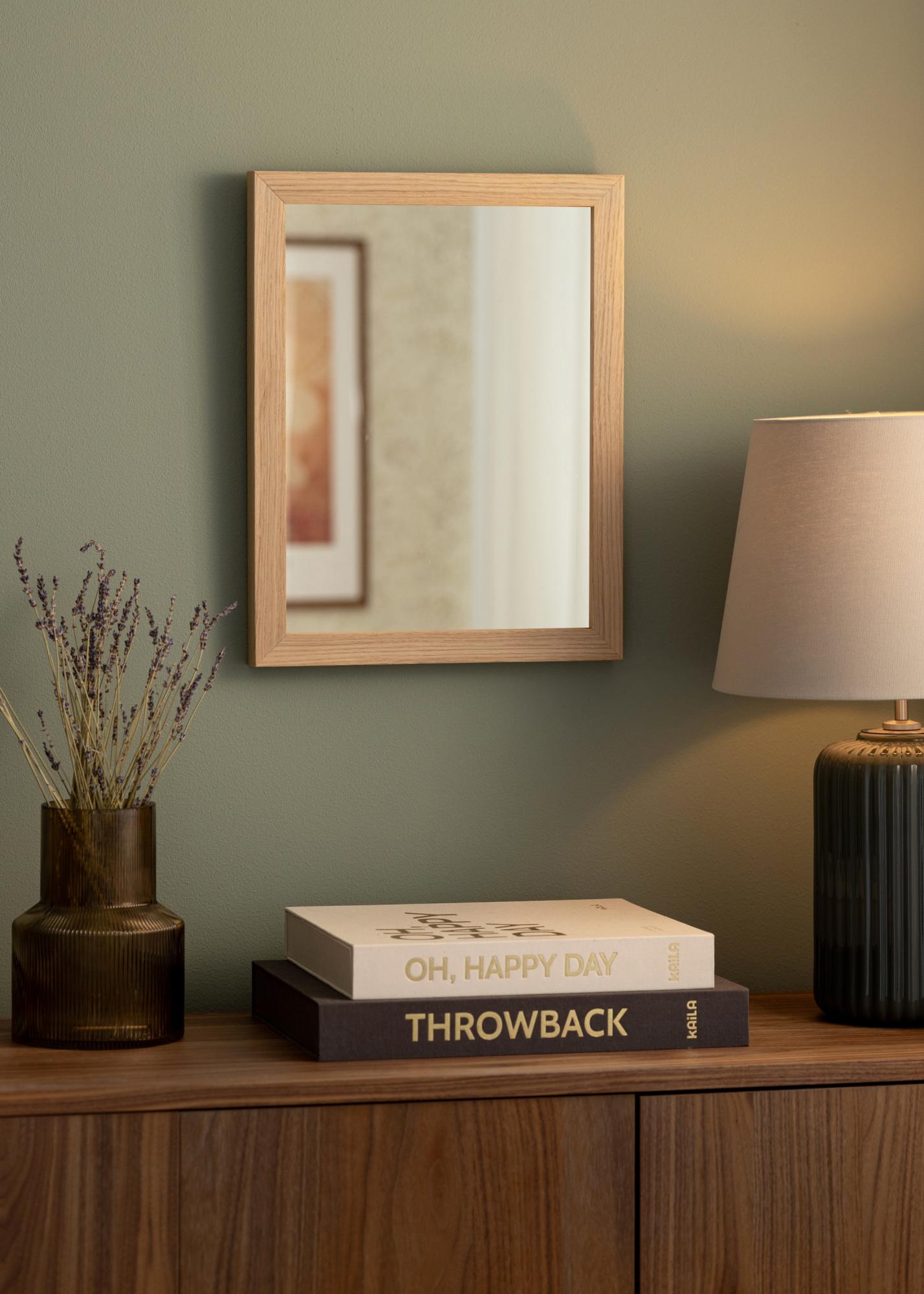 Rammen er laget av furu, noe som gjør den både holdbar og lett. Dybden på 32 mm gir speilet en stabil konstruksjon og gjør at det sitter sikkert på veggen. Den varme tonen i eikemønsteret fremhever speilets tidløse design og gjør den lett å matche med ulike interiørstiler.