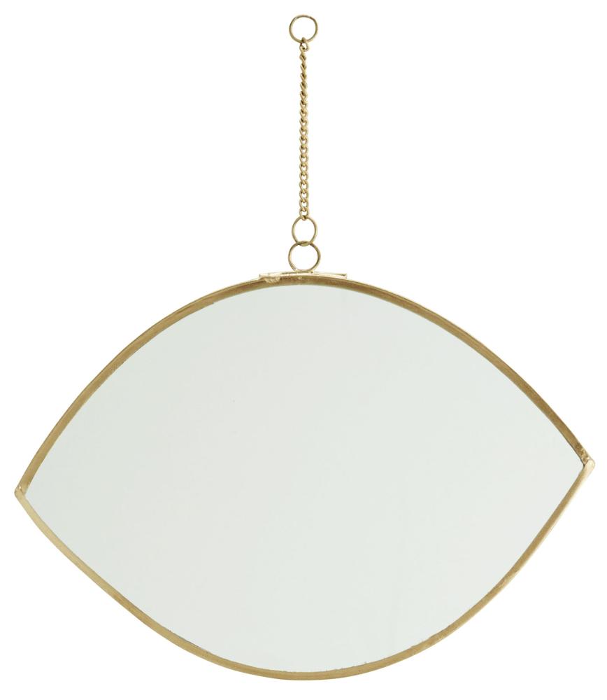 La dette vakre speilet fra Madam Stoltz bli en iøynefallende interiørdetalj i hjemmet ditt. Den spesielle formen etterligner et øye, som sammen med den messingfargede rammen gjør dette til et svært elegant veggspeil. Speilet henges opp i et pent kjede som ytterligere forsterker følelsen av eleganse. Denne speilmodellen kommer i to ulike størrelser, og dette speilet er 16 cm langt. Den nette størrelsen gjør at veggspeilet er superfint sammen med andre speilmodeller.