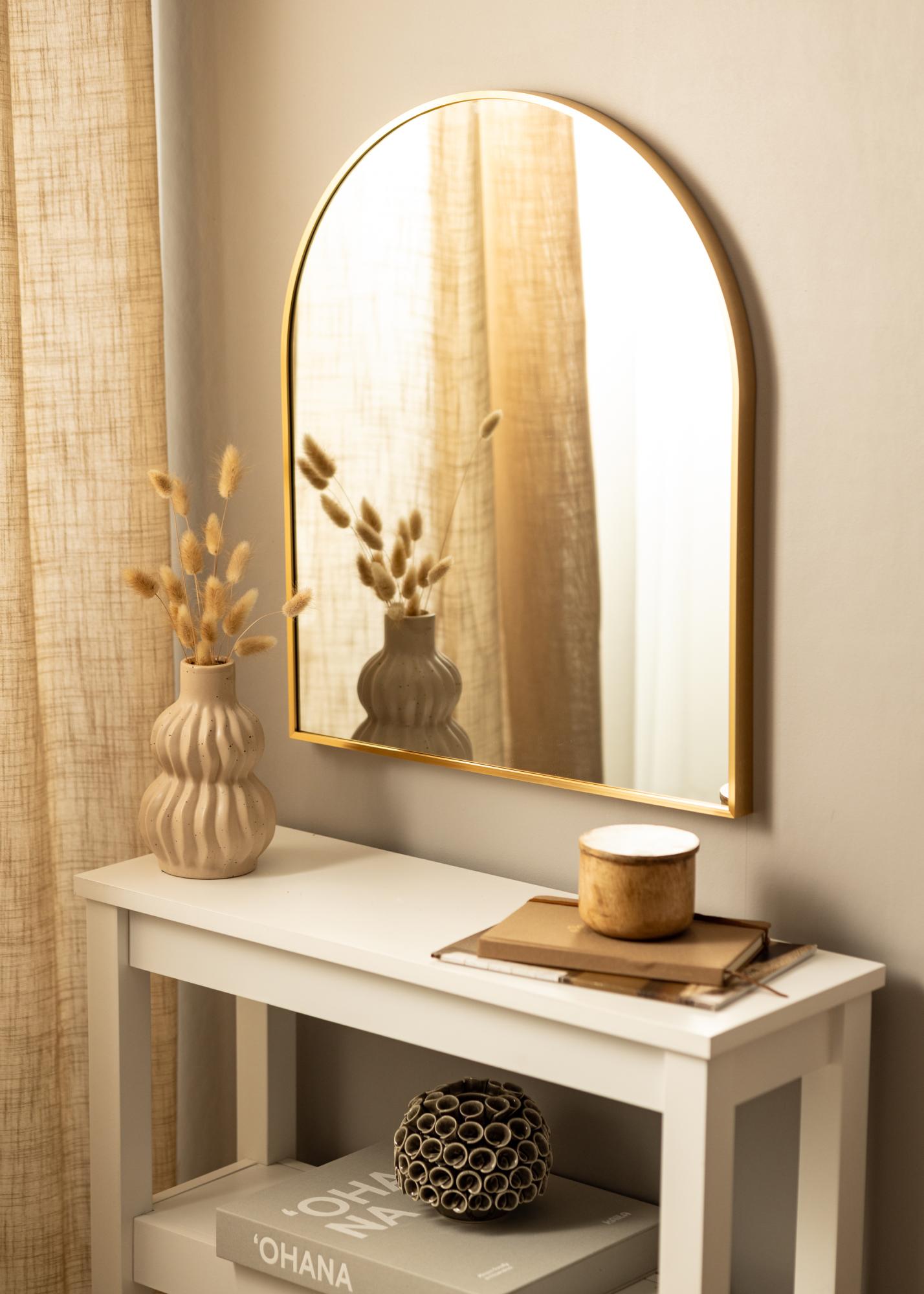 Dette er et moderne veggspeil som kan brukes i alle rom. Du kan enten la det bli en trendy detalj på soverommet eller i stua, eller bruke det som baderomsspeil eller gangspeil for å kunne speile deg ordentlig selv når du gjør deg klar for dagen. Speilet har en 28 mm dyp metallramme, med en eksklusiv gullfarge som gir det utsøkt finesse. Den stilige buede formen forsterker det luksuriøse uttrykket ytterligere.