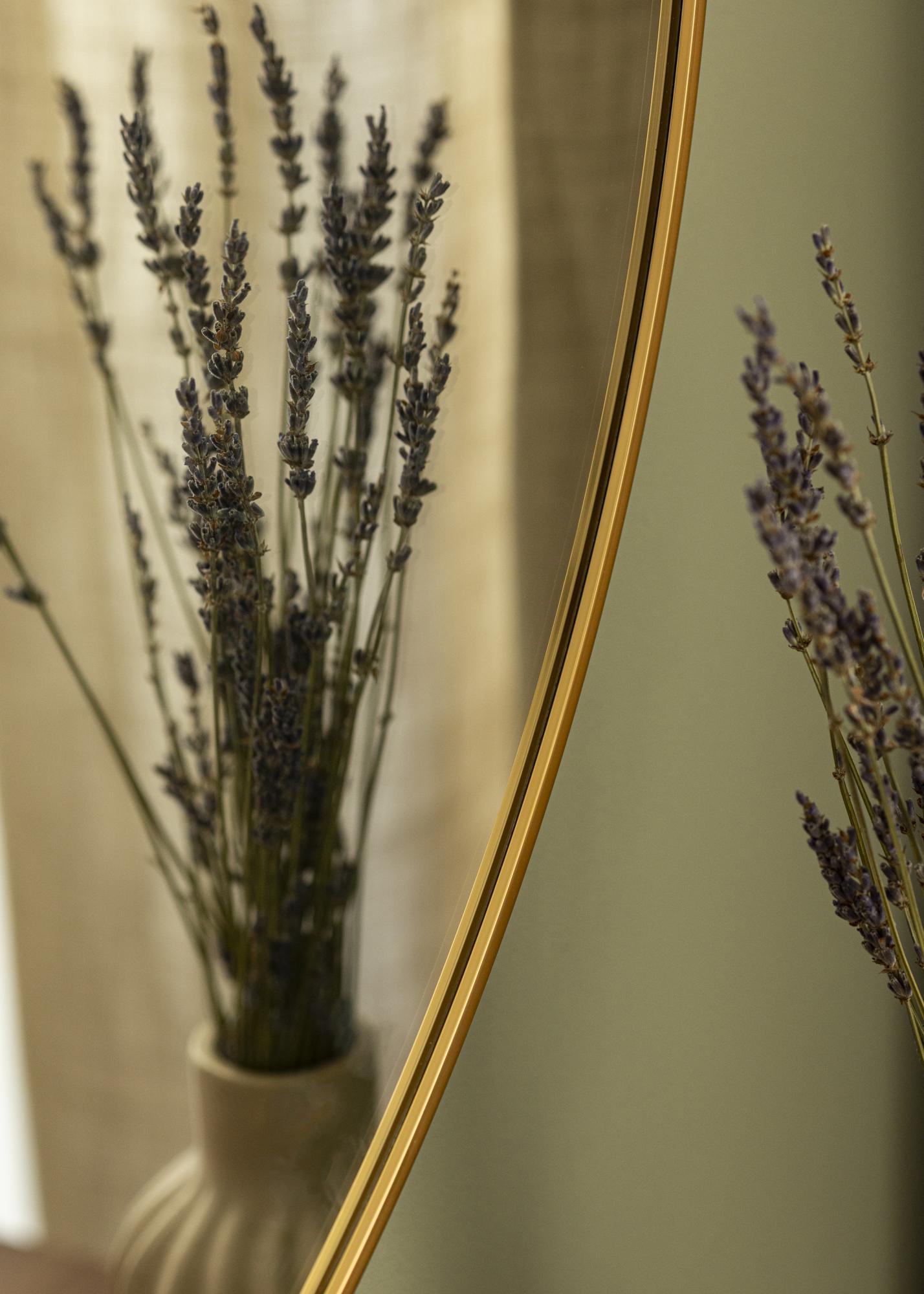 Dette veggmonterte speilet har en klassisk rund form som er omgitt av en elegant gulltonet aluminiumsramme. Rammen sin farge og glans skaper en luksuriøs atmosfære og blir en iøynefallende detalj på enhver vegg. Den runde formen bidrar til en myk og harmonisk følelse i rommet.