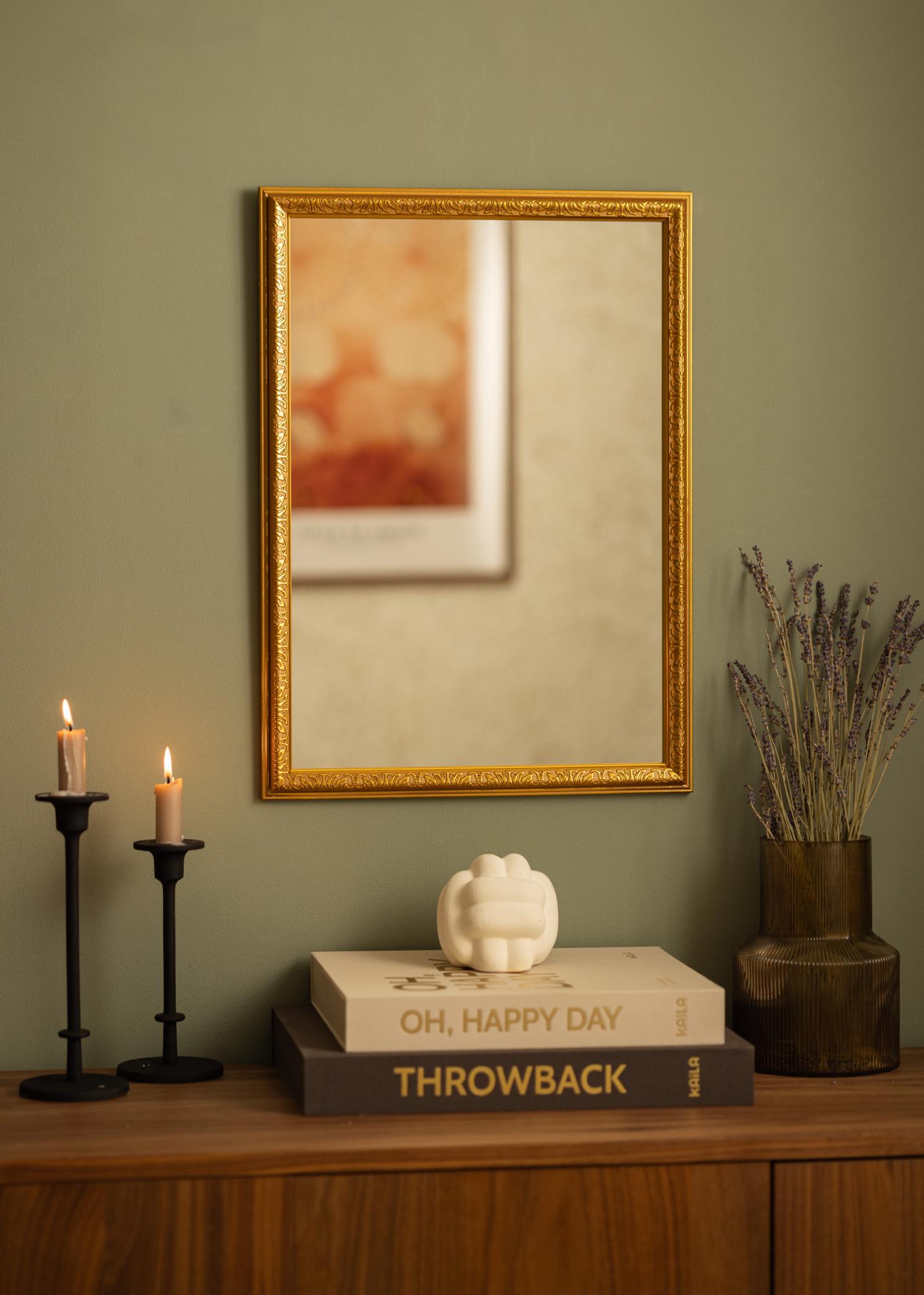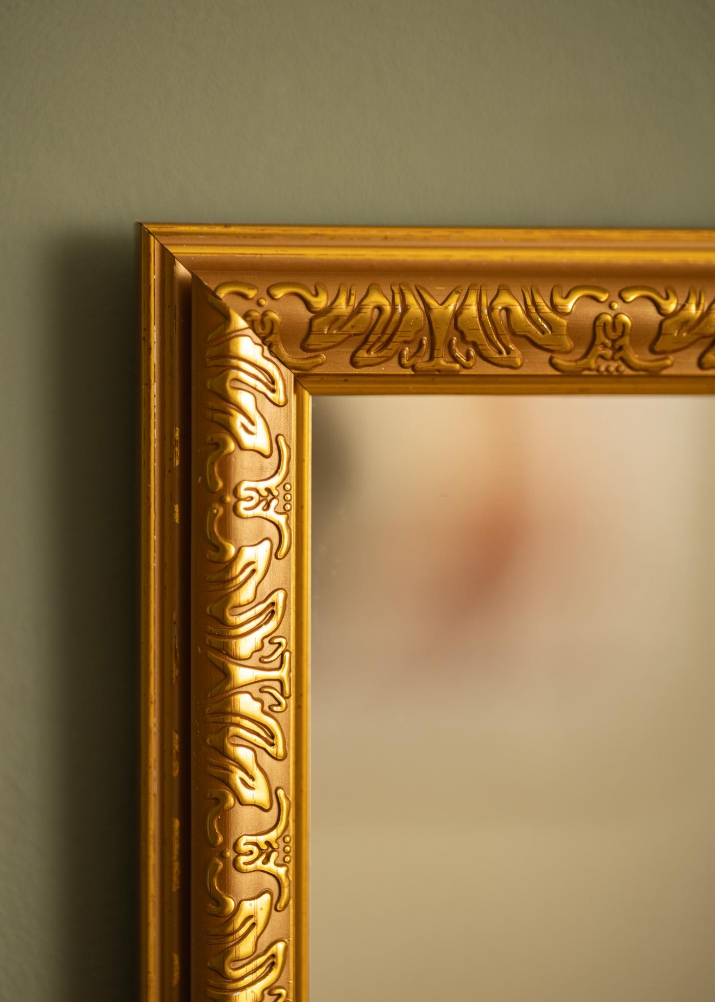 Er du på utkikk etter et luksuriøst gullfarget speil kan du slutte å lete nå. Nostalgia Gull er et veggspill med 2,8 cm bred ramme med elegant profil og et vakkert dekorativt mønster. Speilglasset vil reflektere lyset i rommet ditt, samtidig som speilet selv blir en stilig detalj på veggen din. På baksiden er det veggfeste for enklere opphenging.
