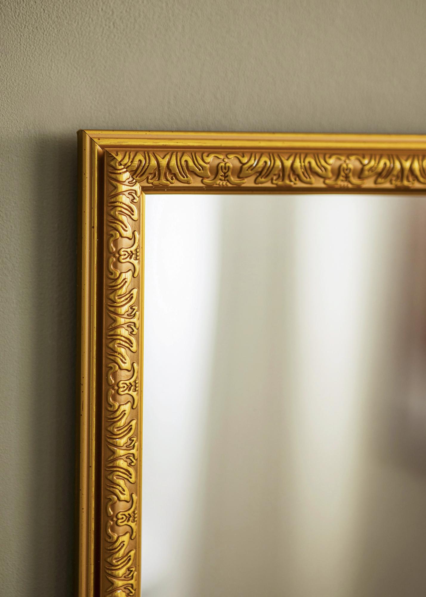 Er du på utkikk etter et luksuriøst gullfarget speil kan du slutte å lete nå. Nostalgia Gull er et veggspesil med 2,8 cm bred ramme med elegant profil og et vakkert dekorativt mønster. Speilglasset vil reflektere lyset i rommet ditt, samtidig som speilet selv blir en stilig detalj på veggen din. På baksiden er det veggfeste for enklere opphenging.