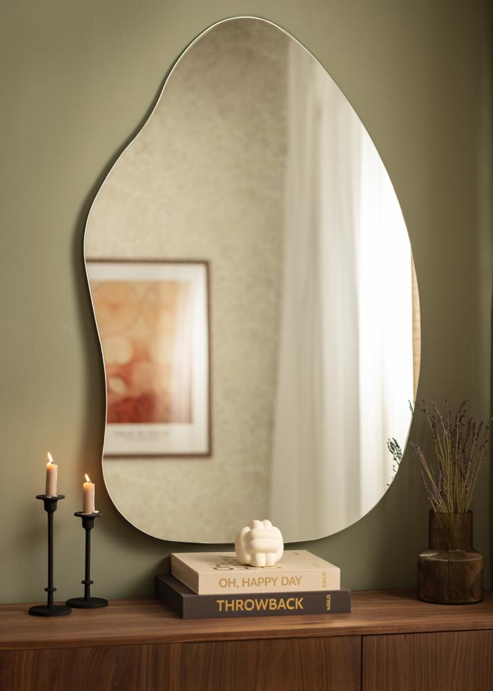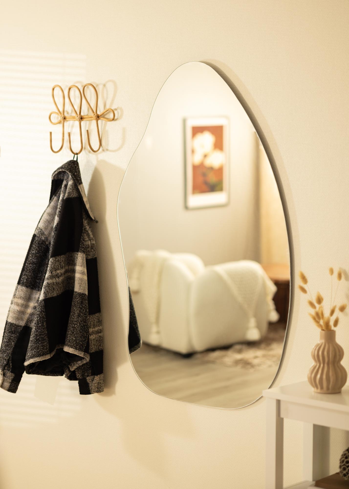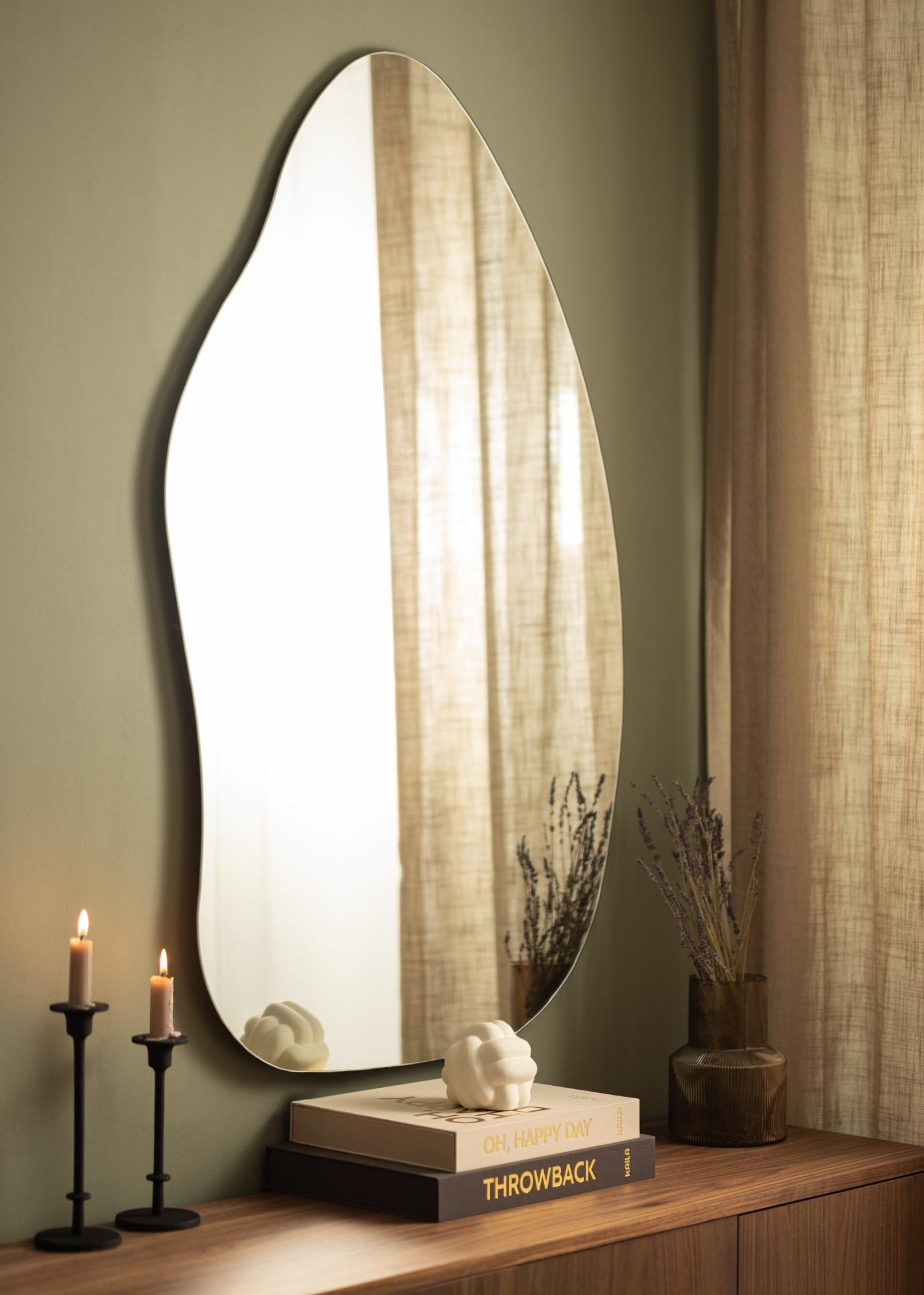 Speilet har en myk og organisk form som minner om en vanndråpe eller et stående blad, noe som gir en elegant og moderne følelse til rommet. Denne unike formen gjør speilet til en samtalestarter og et kunstverk i seg selv, samtidig som det fyller sin praktiske funksjon.