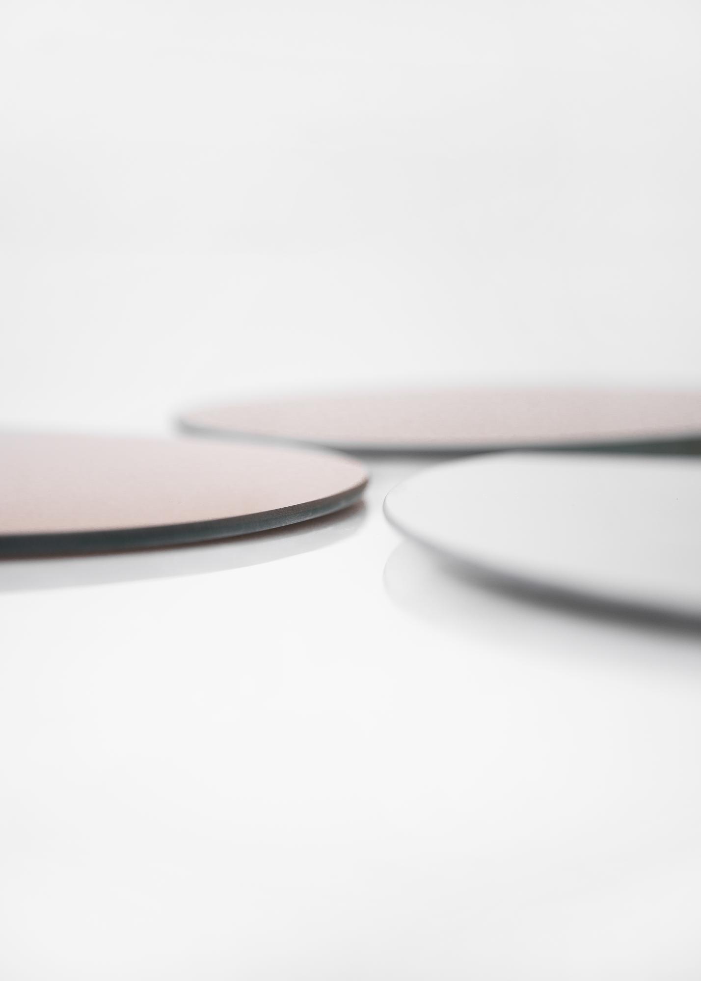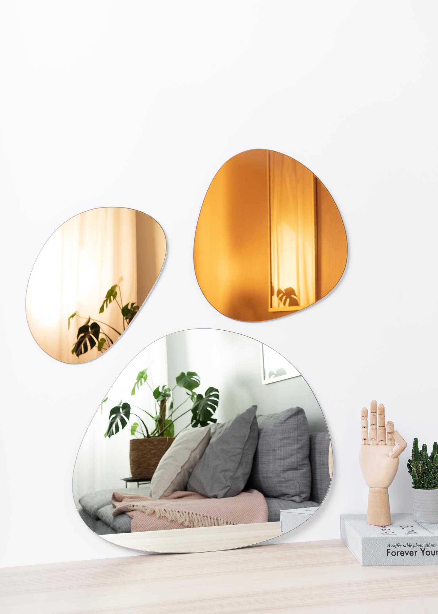Dette er et kult speilsett for alle dere som liker å blande. Det består av tre speil, hvorav ett er oransje, ett er i roségull, og ett har ufarget glass. Det største er i ufarget glass og kommer i størrelsen 53,3x46 cm. Det mellomstore speilet er i oransje i størrelsen 36,5x37,5 cm, mens det minste er i størrelsen 35x23,2 cm og i roségull.