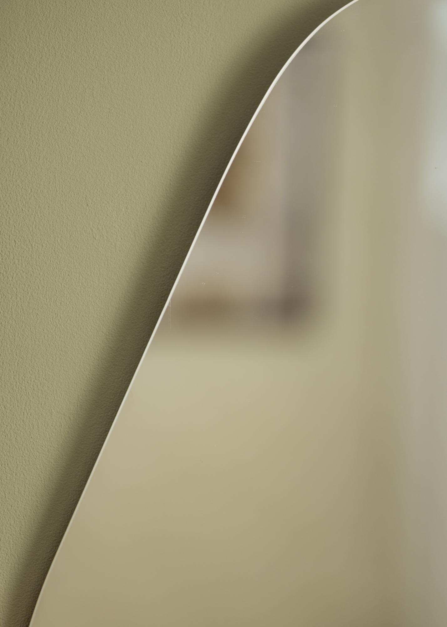 Smooth Cloud er et veggspeil med oval form og lett konkave sider. Det gir et mykt og veldig elegant utseende. Det stilige inntrykket forsterkes av det tynne speilglasset på 4 mm, og det rammeløse designet. Dette speilet veier 2 kg og er 40x65 cm stort.