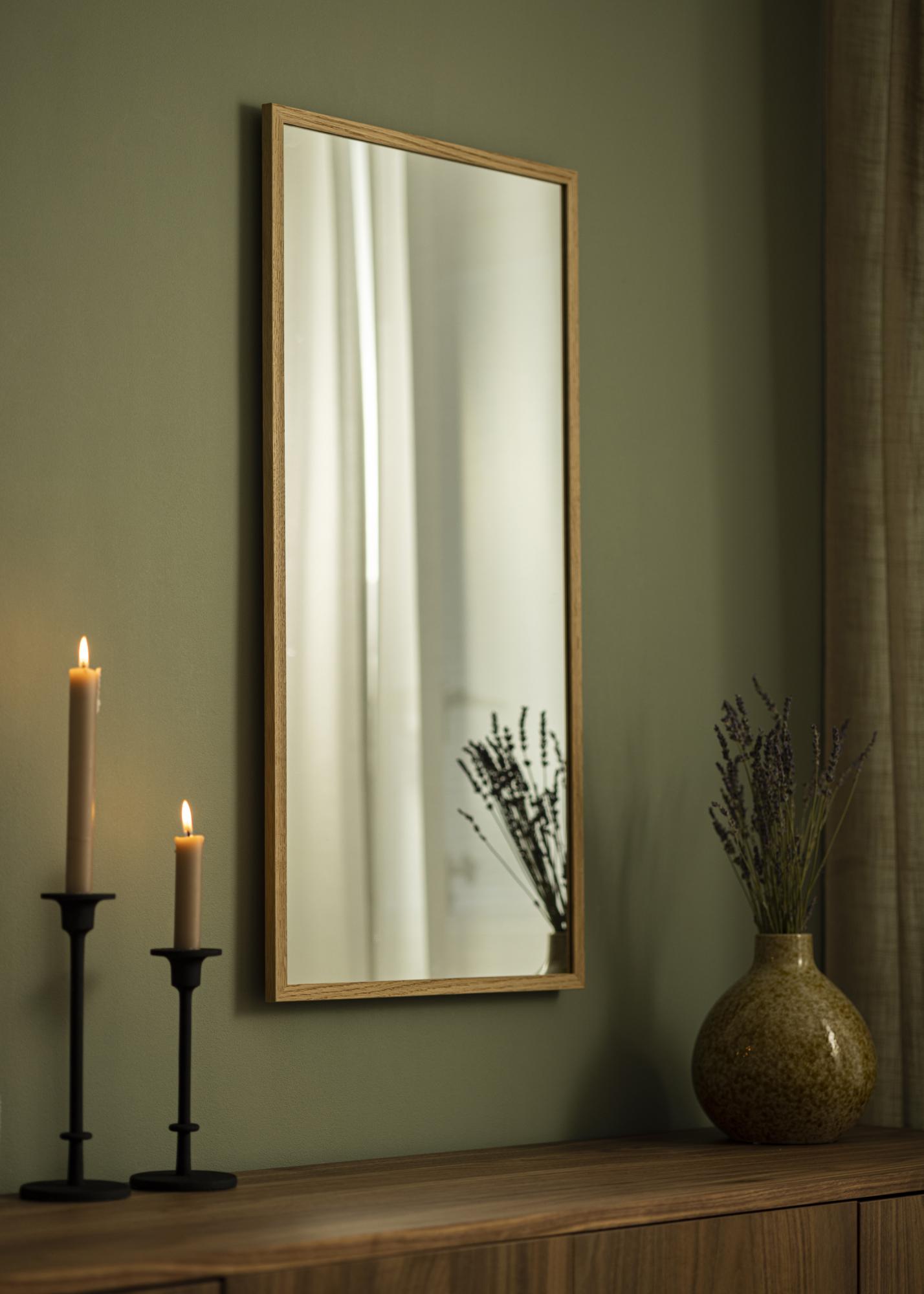 Dette rektangulære speilet er innrammet i solid eik, noe som gir en varm og organisk følelse til din innredning. Den naturlige trerammen er ikke bare vakker å se på, men bidrar også til en bærekraftig og tidløs design som varer i mange år fremover.