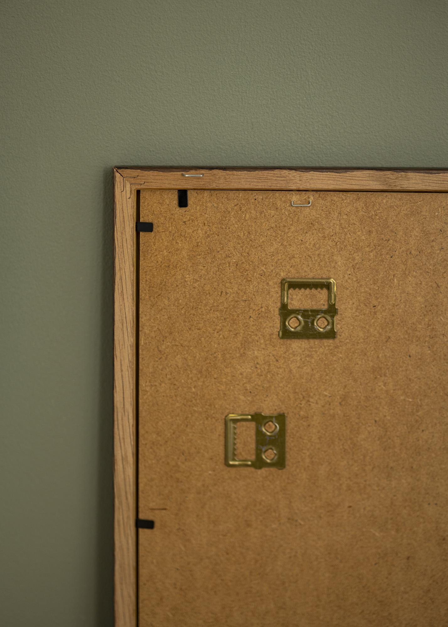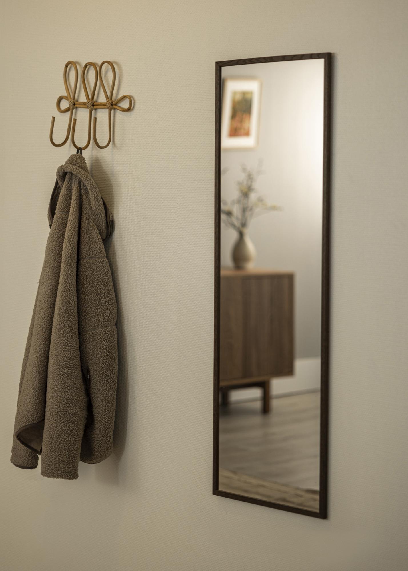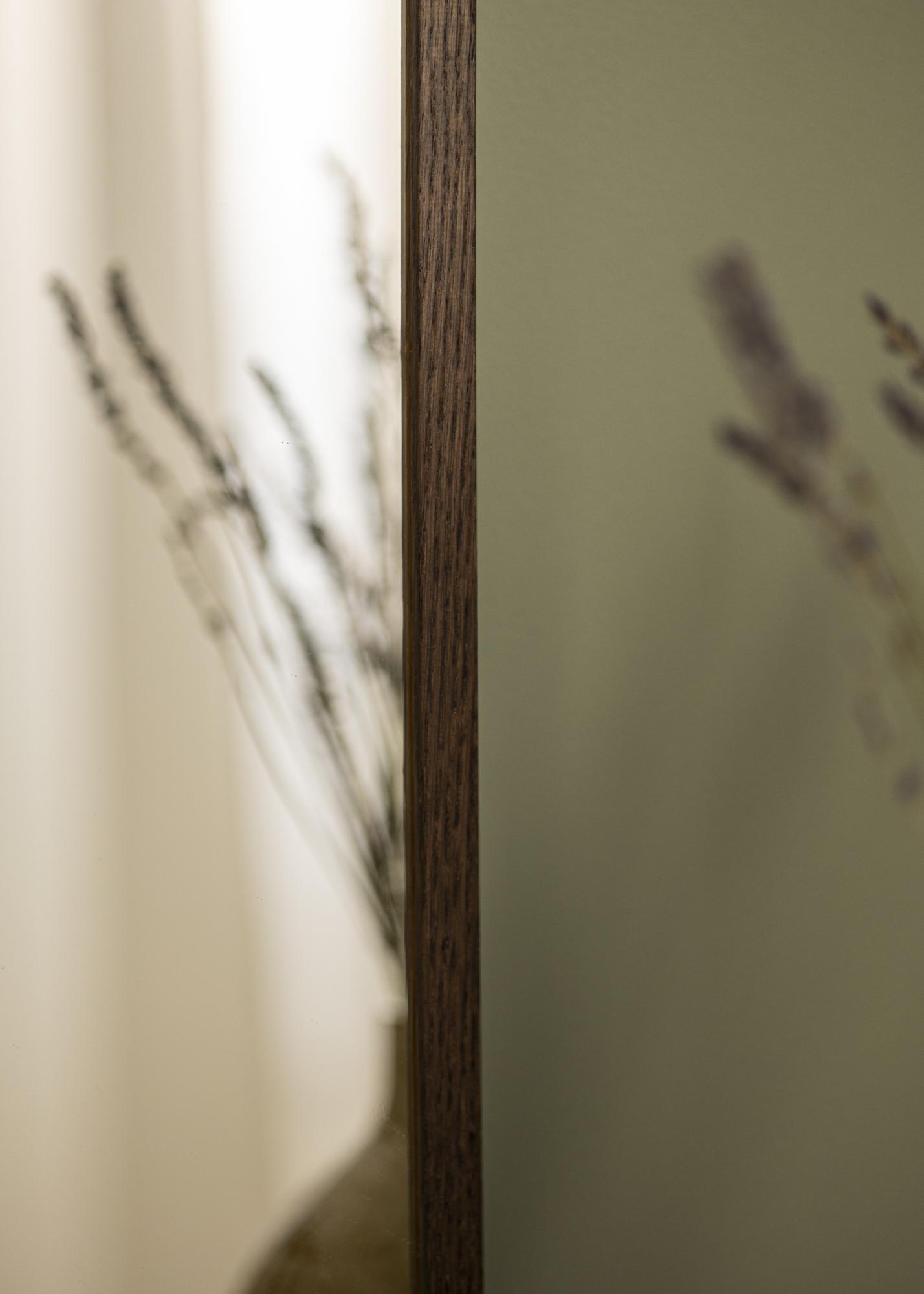 Speilrammen er laget av ekte eiketre og har en dyp mørk eikefarge som umiddelbart trekker øyet mot seg. Den tykke rammen gir en robust følelse og bidrar til speilets generelle tilstedeværelse. Dette speilet er ikke bare en praktisk tilvekst, men også et kunstverk som passer både moderne og tradisjonell innredningsstil.