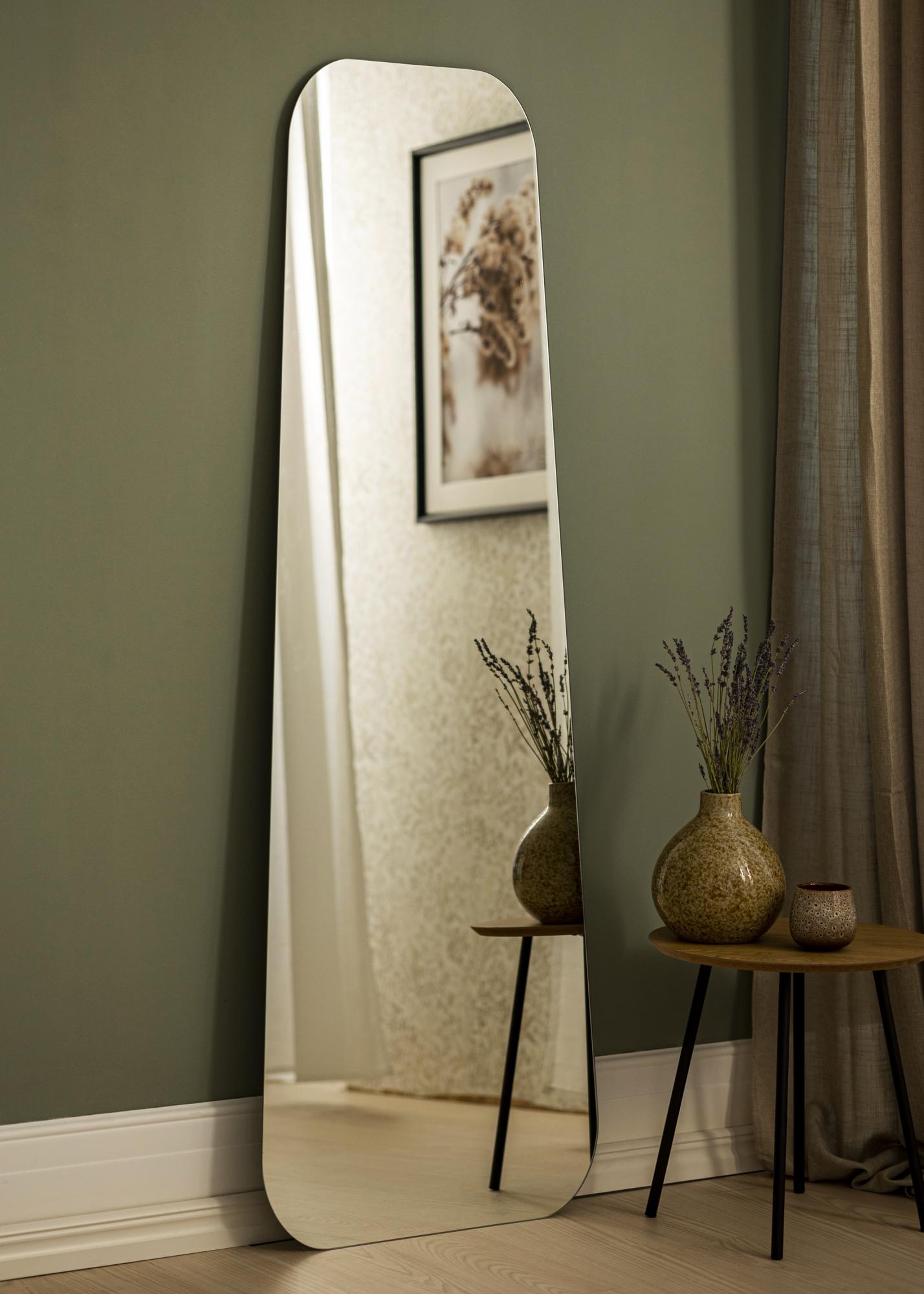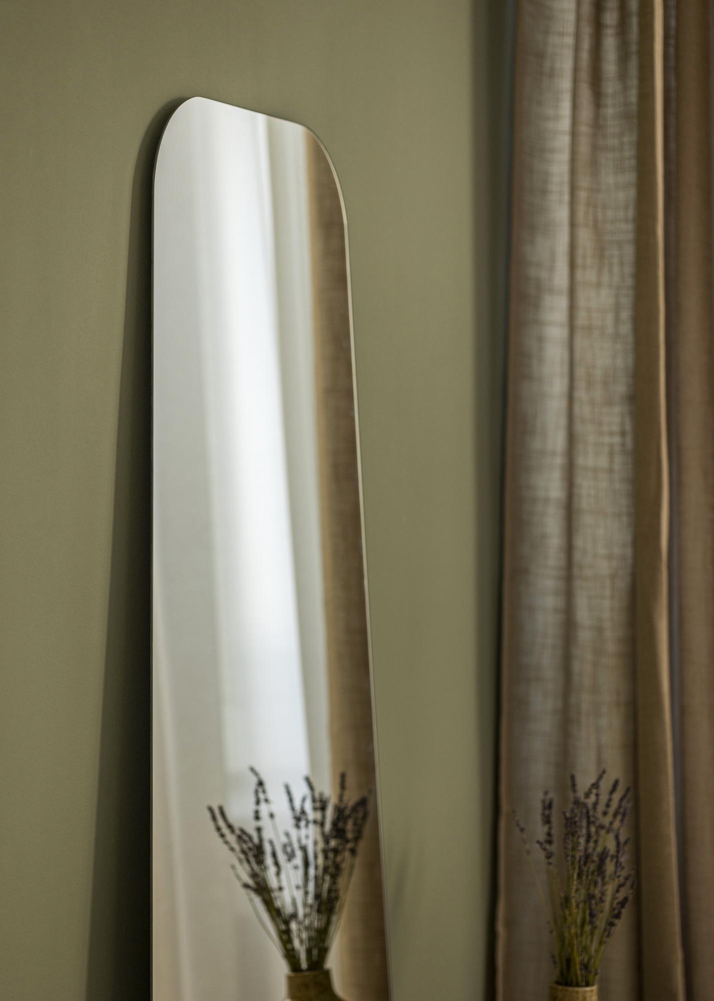 Oppdag den stilsikre og allsidige speilet som er designet for å passe inn i ethvert hjem. Med sine generøse mål på 55x155 cm tilbyr dette speilet en full lengde refleksjon som er perfekt for soverommet, gangen eller klesrommet. Speilets iøynefallende form kombinerer eleganse og funksjonalitet, med sine mykt avrundede hjørner og en langstrakt silhuett som gir et moderne preg til rommets innredning.