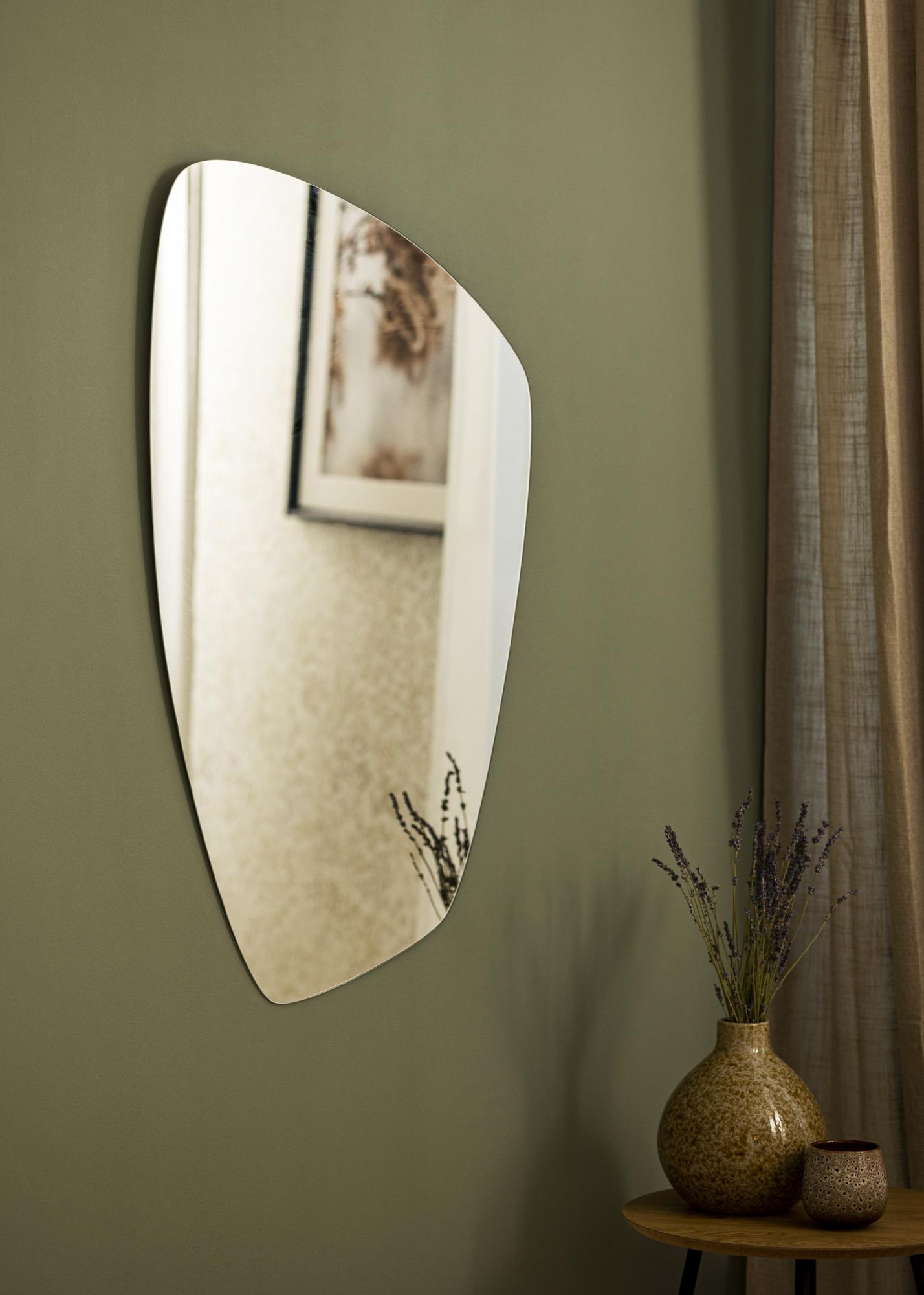 Speilet har en asymmetrisk og buet form som gir et moderne og stilrent uttrykk, perfekt for en samtidsinteriør. Dens unike design bidrar til en følelse av rom og lys i rommet, samtidig som det fungerer som en praktisk og dekorativ detalj.