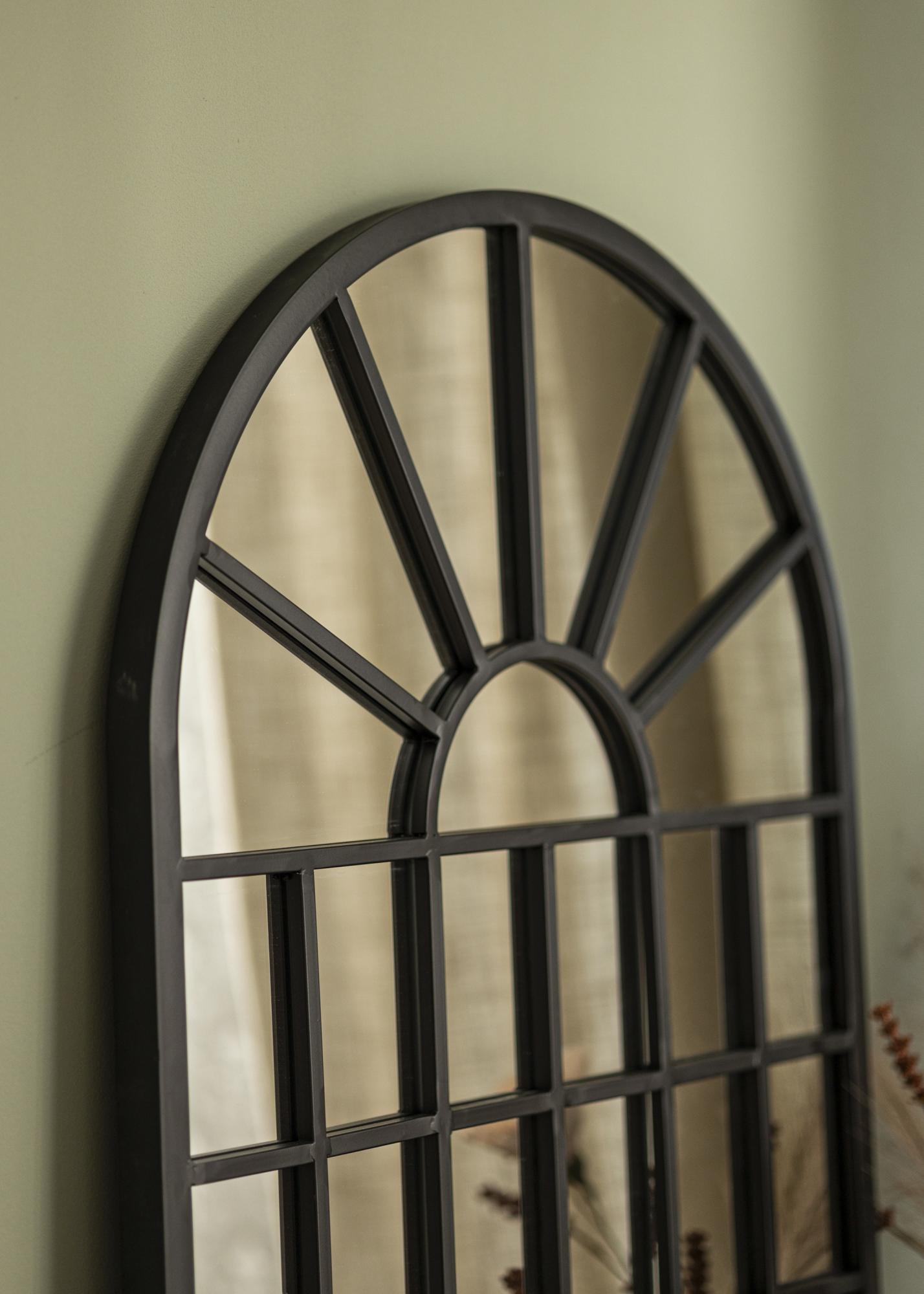 Den svarte metallrammen gir speilet en distinkt og moderne følelse, samtidig som den buede toppen legger til en touch av klassisk eleganse. Speilets form minner om et tradisjonelt vindu, som skaper en illusjon av rom og lys i rommet. Den industrielle stilen blir fullført av metallstriper som deler opp speilflaten, noe som gir ikke bare en elegant detalj, men også bidrar til speilets robuste konstruksjon.