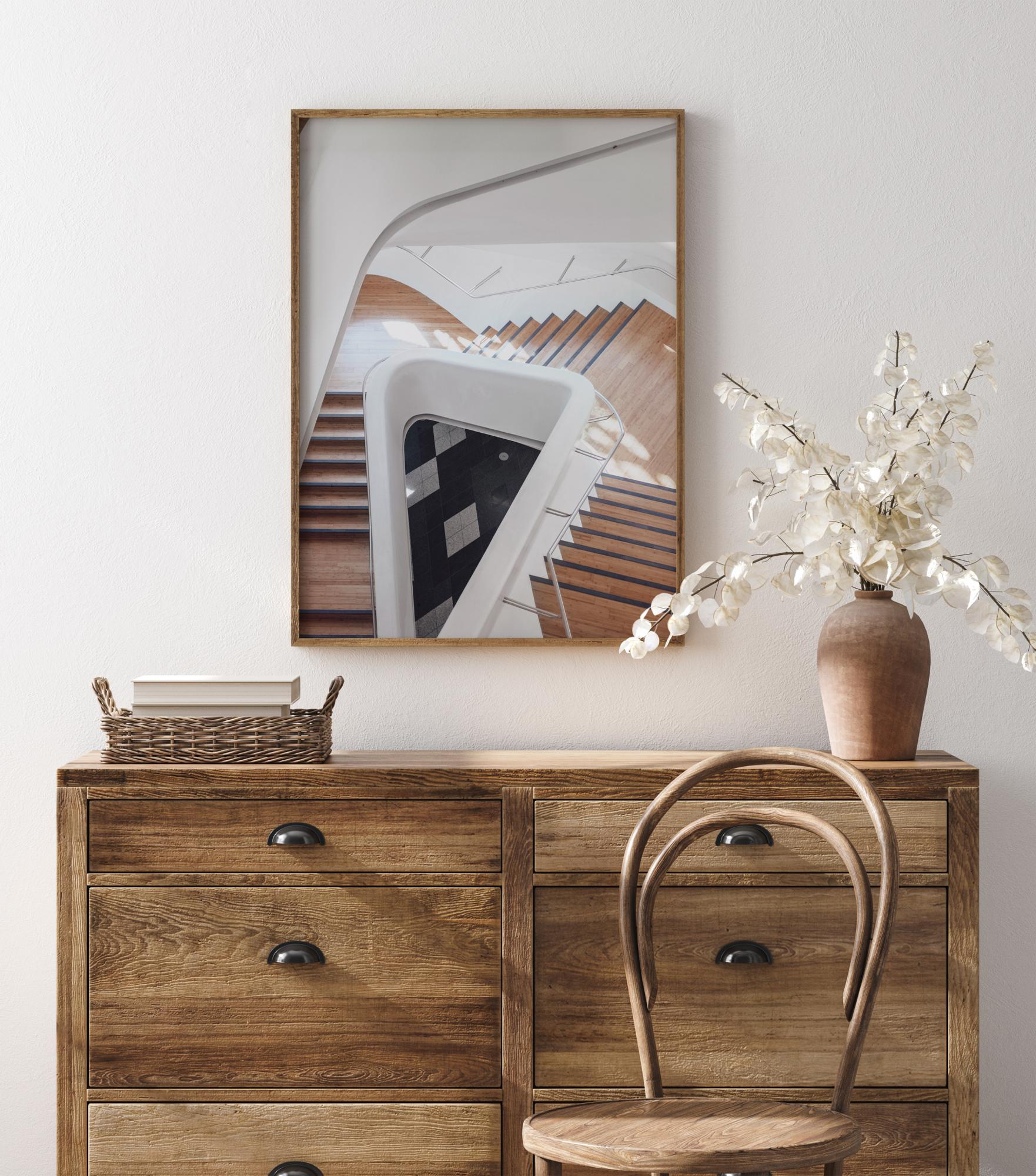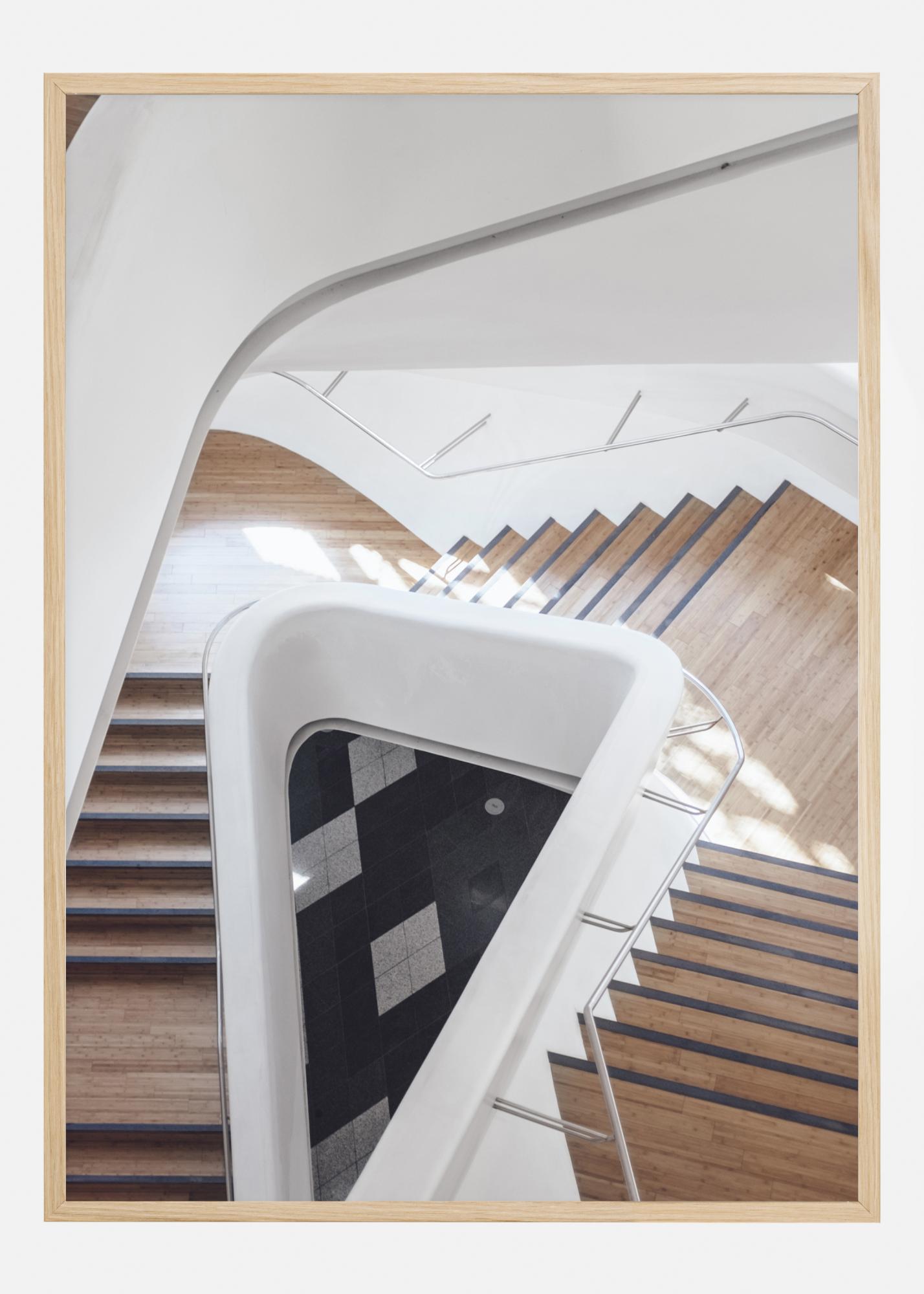 En interiør-plakat med en trekantformet trapp. Trinnene er brune, og veggene og rekkverket hvitt med stålgelender. De kurver ned og rundt til et svart og hvitt flislagt gulv under. Se ned ovenfra i dette Escher-lignende bildet, og forestill deg at du går opp og ned disse vakre trinnene.