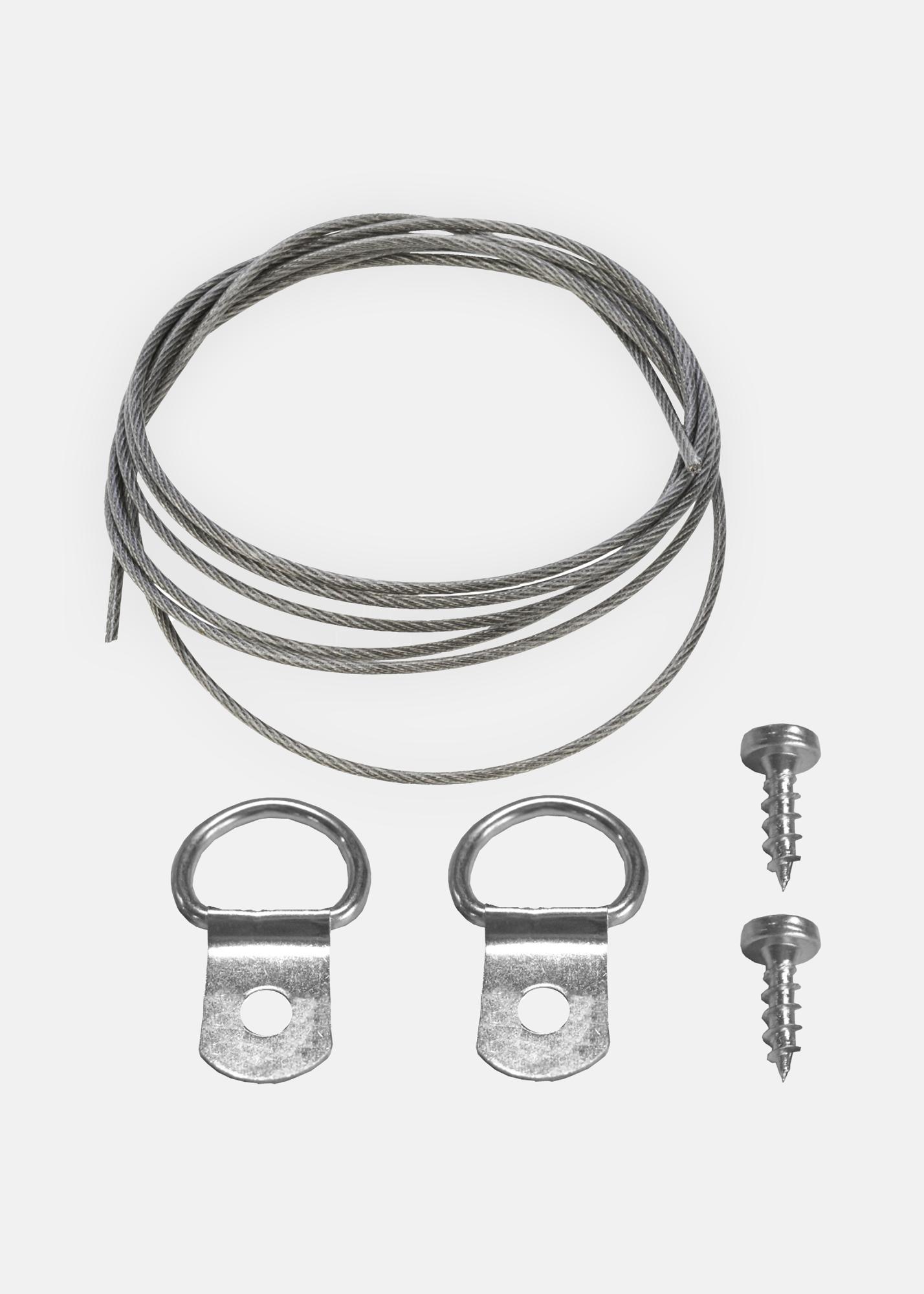 Med dette komplette settet har du alt du trenger for å montere en ståltråd på bildet ditt: 1 meter lang ståltråd, 2 skruer og 2 hemper/kroker. Ståltråden er galvanisert og slitesterk, men bare 0,7 mm tykk, noe som gjør den enkel å jobbe med, ettersom den kan bøyes og vris slik du ønsker.