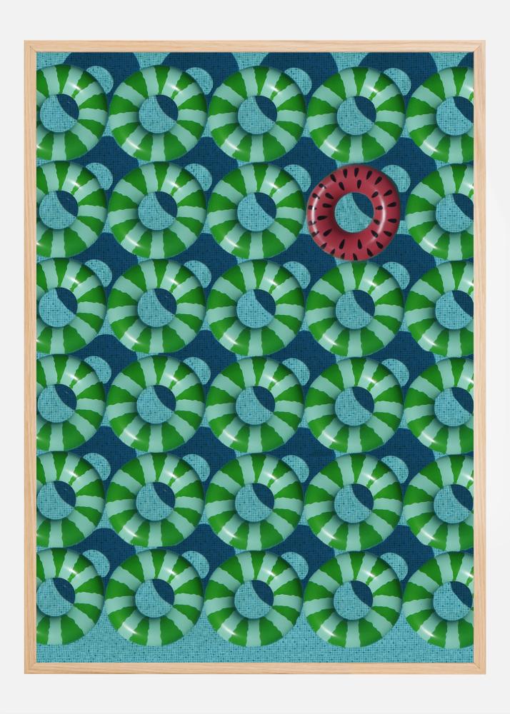 Denne lekne og fargerike posteren er en hyllest til individualitet og originalitet. I et hav av identiske grønne og hvite baderinger fanger en ensom vannmelonbadering blikket og byr på en umiddelbar følelse av glede og moro. Denne printen er en perfekt sommerkamerat, som løfter frem det unike i å skille seg ut fra mengden.