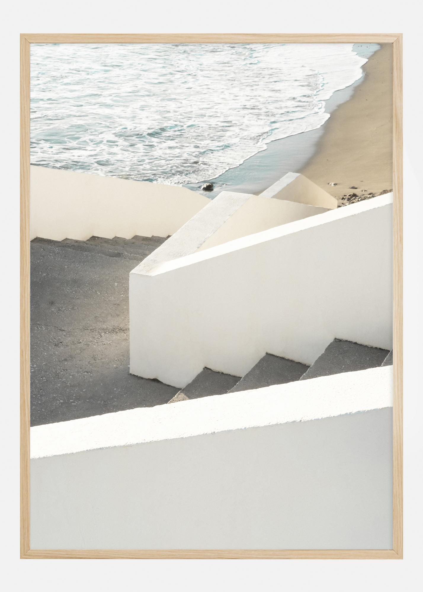Denne posteren gir en følelse av både arkitektur og natur ved å vise en hvittrappet struktur som leder ned til en fredelig strand og det rolige havet. Spillet mellom lys og skygge på trappetrinnene, sammen med kontrasten mellom den stramme arkitekturen og den myke strandlinjen, skaper et bilde som er både beroligende og visuelt interessant.