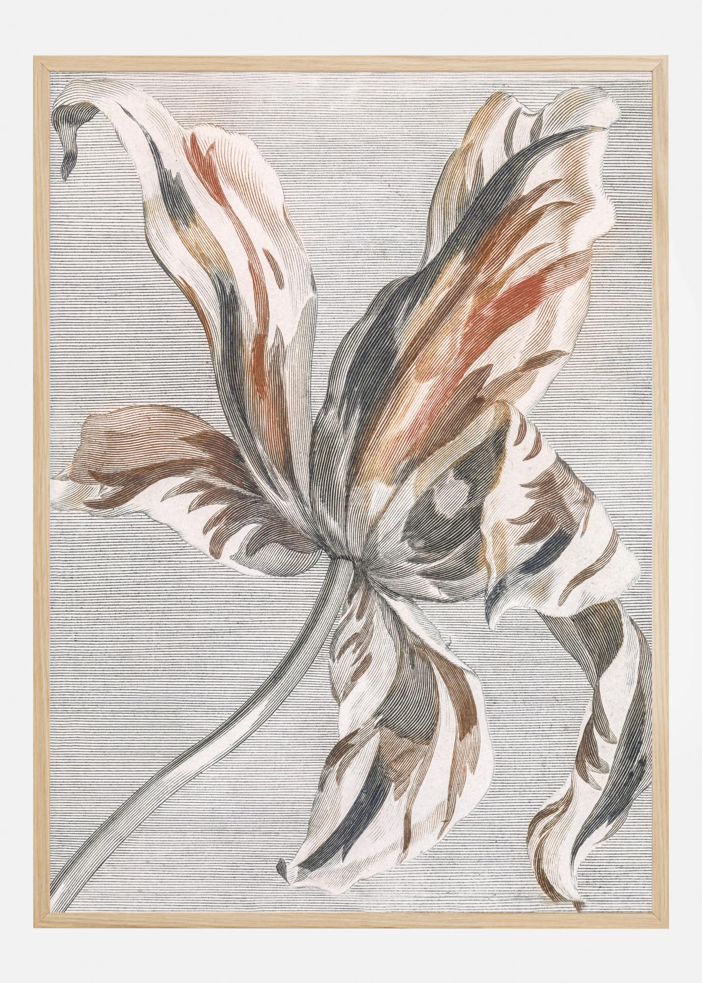 En blomsterplakat med en dristig blomst med rød, hvite og grå striper. Flytende penselstrøk følger kronbladenes linjer for å gi liv i stykket. Match de sterkefor å skape livet i stykket. Kombiner de sterke røde fargene på veggen der du henger bildet for en enda mer livlig effekt.