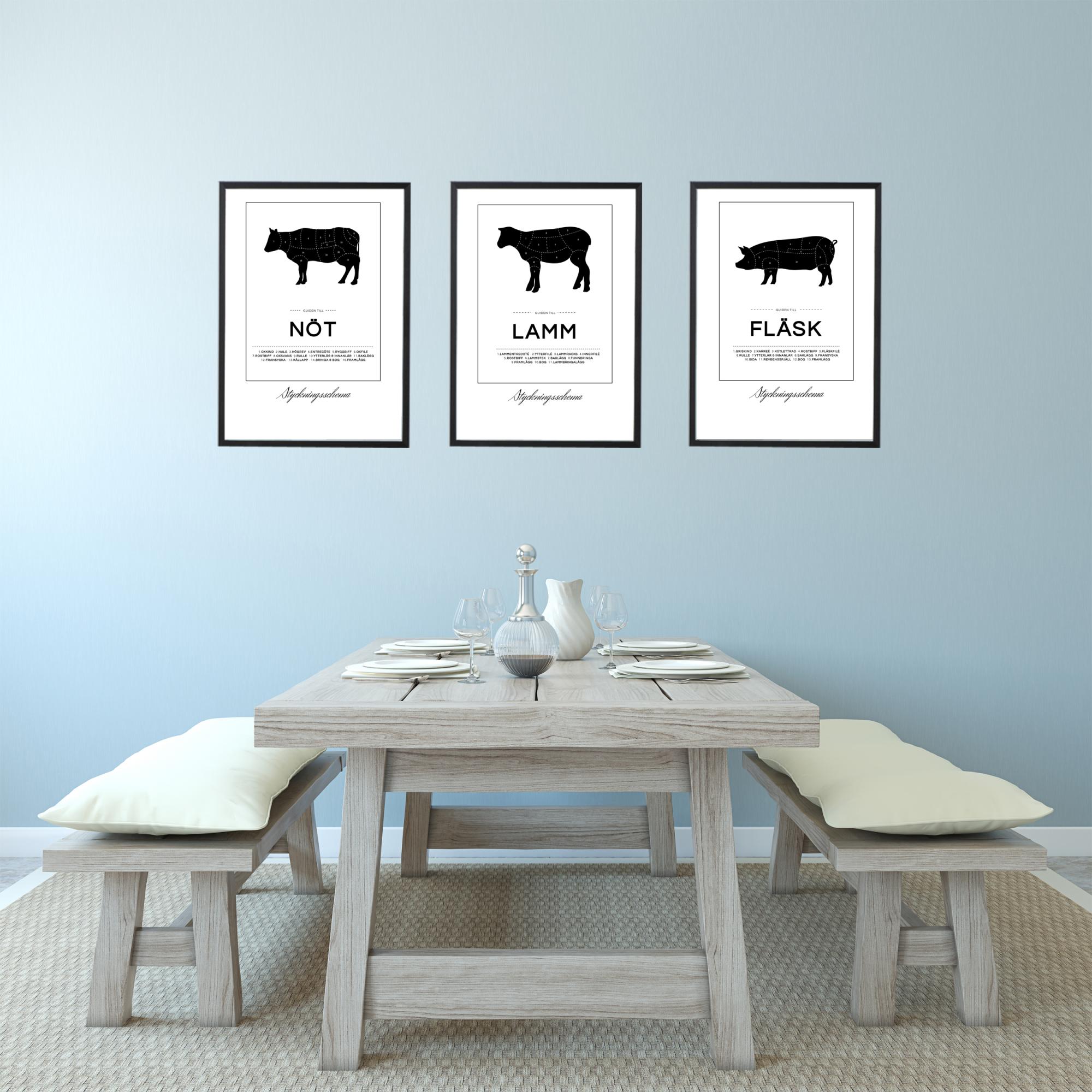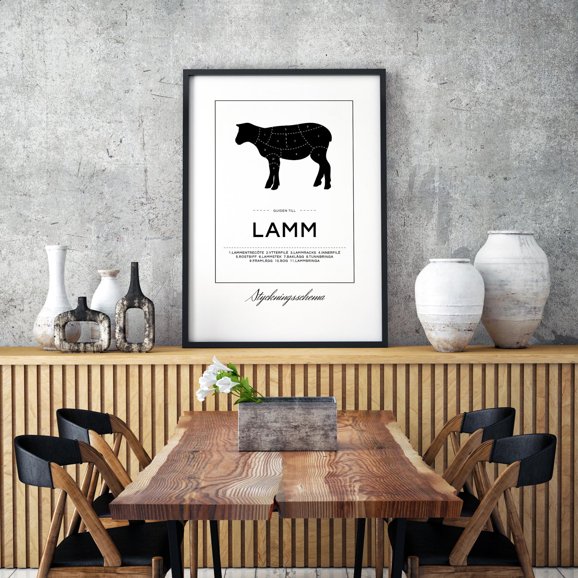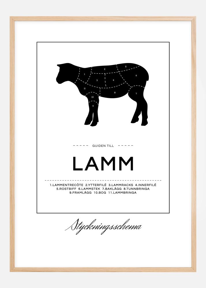 Lær deg hvor du finner alle delikatessene fra lammet med denne fine posteren på veggen. Posteren forestiller et svart lam som er oppdelt i markeringer. Disse viser hvor man finner f.eks. ytrefilét, lammecarré og bog på dyret. Som komplement til bildet står teksten”'Guiden till lamm” sammen med en pyntelig, nummerert liste med oversikt over de ulike delene. Rundt teksten og bildet går det et tynt rektangel, og under rektangelet er der et trykk med teksten ”'Styckningsschema”. Designet, som går i svart/hvitt, gjør seg utmerket sammen med en sølvramme eller en ramme i din favorittfarge. Posteren kommer i flere ulike størrelser, så du finner lett en som passer i akkurat ditt kjøkken.