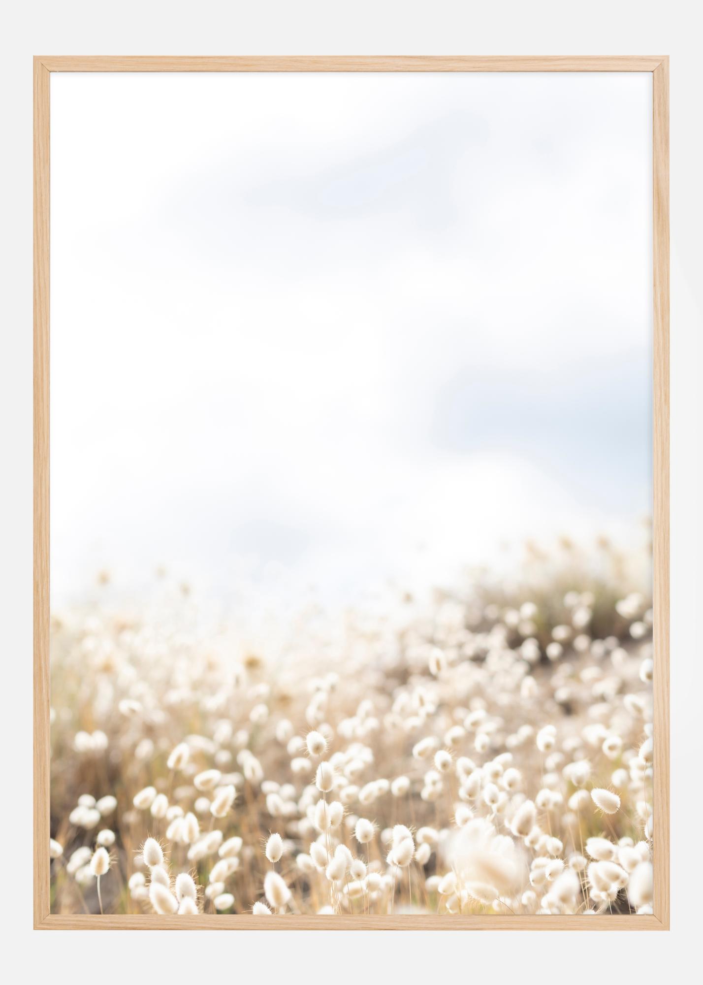 Denne drømmende posteren fanger en eng full av lette, luftige blomster som bader i et mykt sollys. Motivet, fylt av natur og stillhet, formidler en følelse av varme og ro. De hvite blomstenes forsiktige hoder nikker i den stille brisen, og bildet er drapert i pastelltoner av gul, beige og hvit som smelter sammen med den klare blå himmelen.