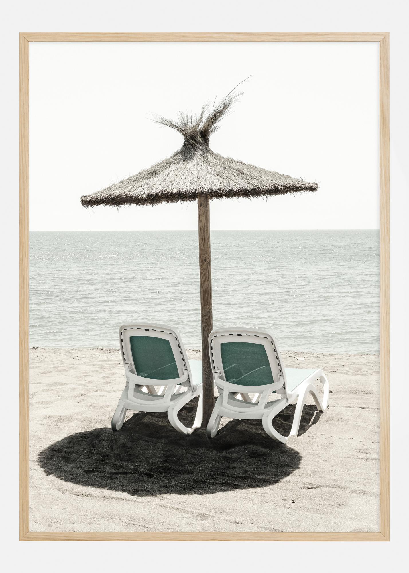 Drøm deg bort til lyden av bølger og følelsen av solvarm sand med denne beroligende plakaten. To tomme solstoler under en parasoll av strå venter innbydende på stranden, med havets horisont i bakgrunnen. Denne stillferdige scenen er et uttrykk for avslapning og en flukt fra hverdagen.