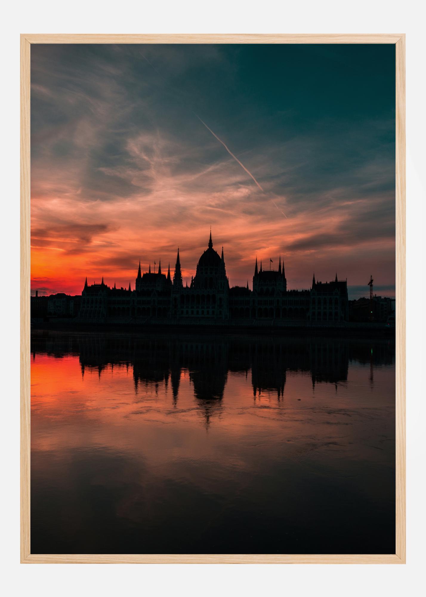 En solnedgang-plakat av en by med utsikt over en stor strekning av vann. Den sterke svarte silhuetten av tårnene i byen gjenspeiles i vannet. I bakgrunnen belyser en strålende rød solnedgang himmelen som kaster et dramatisk lys over vannet og byen.