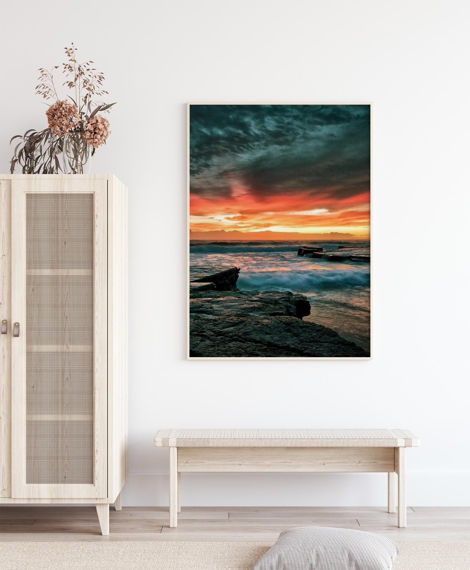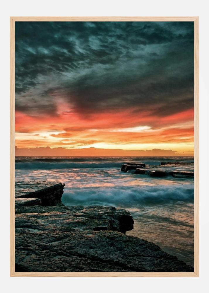 En episk plakat med en solnedgang over vann. Bølger fra havet som krasjer mot den flate steinete kysten. Mørke skyer henger direkte ovenfor, med en lys rød solnedgang lavt i horisonten som skaper et dramatisk og imponerende bilde som vil holde oppmerksomheten din.