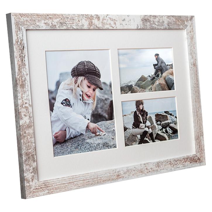 Stilig vintageramme med en bred rammeprofil med et slitt utseende i hvitt og tre. Gir en ekstra dimensjon til bildene dine, og er ideell når du vil ha en ekte vintagefølelse. Rammen har plass til 3 bilder i ulike størrelser.