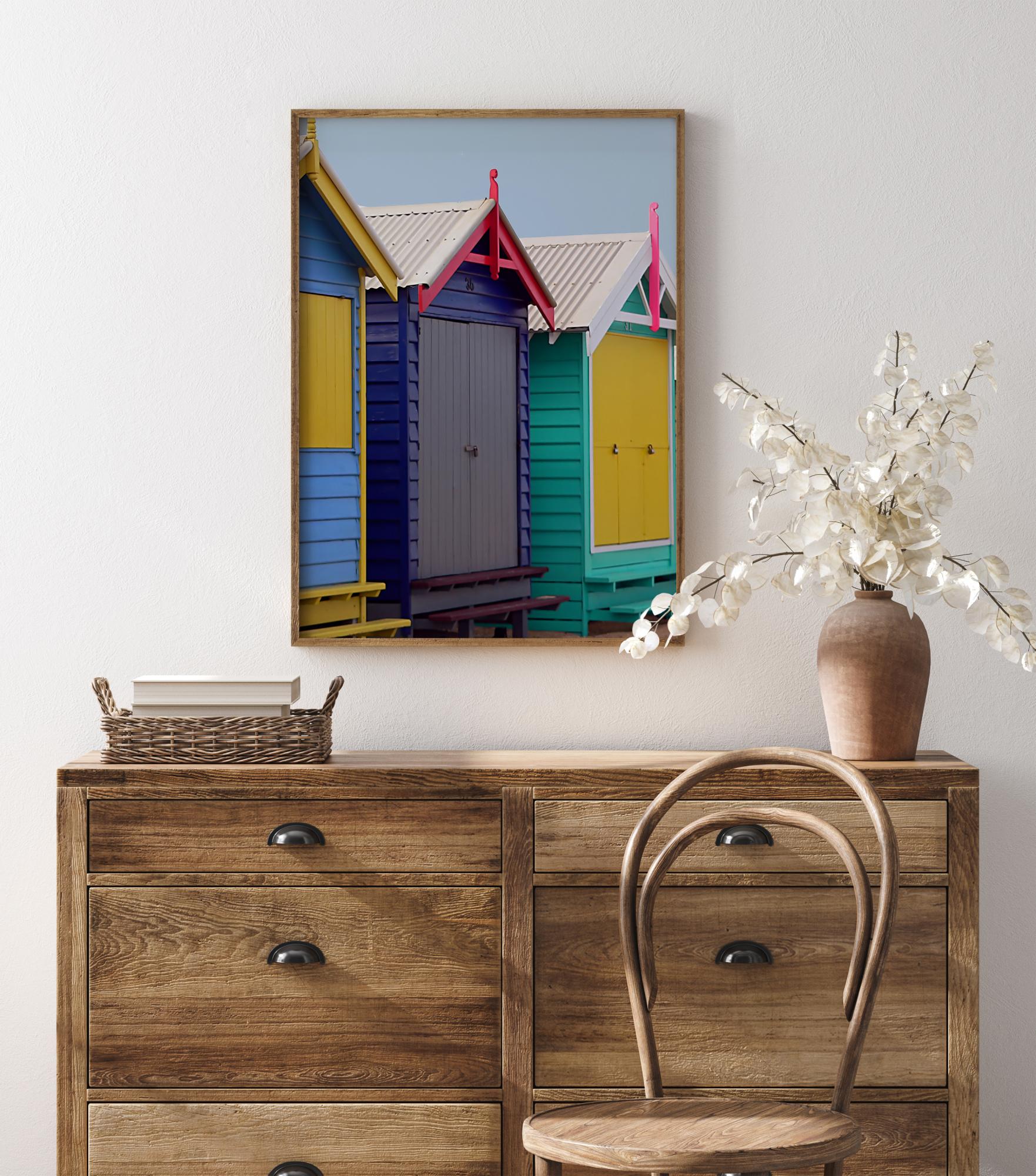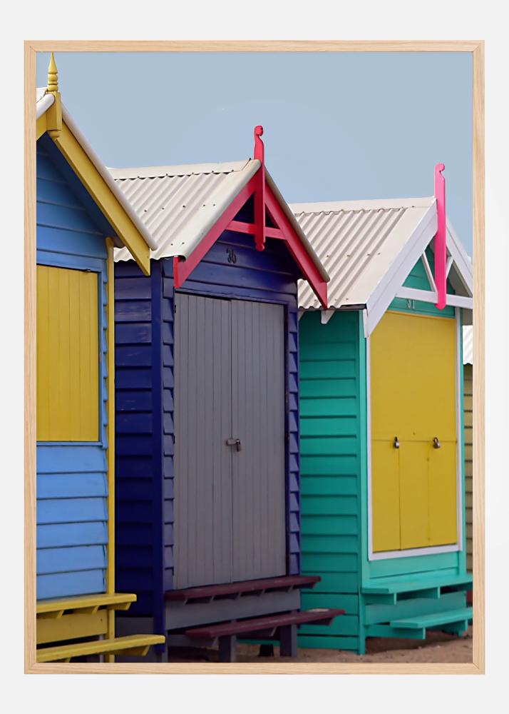 En sterk plakat med fargerike strandhytter. Hver av hyttene er malt i ulike livlige farger i gult, blått, rosa og turkis. Bring hjem sommer- og strandstemningen med mange farger når du henger denne plakaten på veggen din.