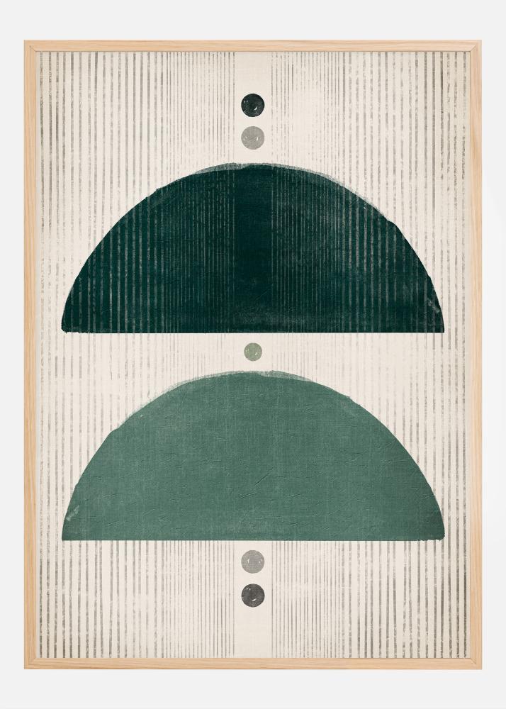 Denne plakaten er mer enn bare et dekorativt bilde; det er en samtidskunstnerisk tolkning som forener det naturlige med det stiliserte. De tre sirkulære formene, sentrert mellom de halvsirkelformede blokkene, fungerer som et fokus som samler hele komposisjonen. Denne printen kunne tjene som en elegant veggfunksjon i et minimalistisk hjem eller kontor, og de beroligende grønne tonene ville gi en følelse av natur og ro til enhver omgivelse.