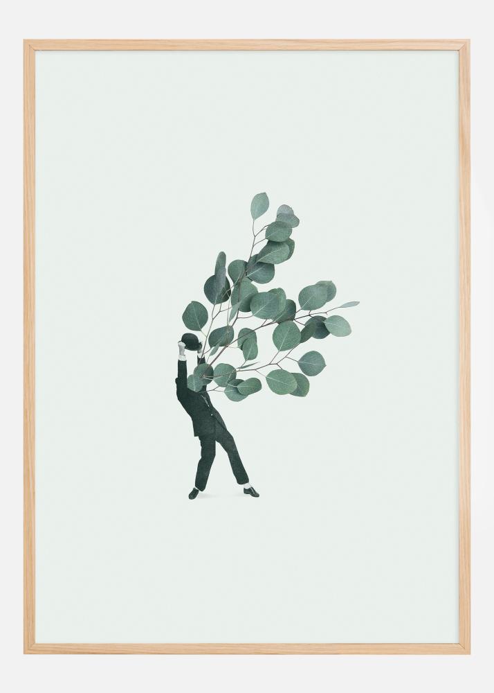 Denne kunstneriske og stilrene plakaten presenterer en minimalistisk silhuett av en person som bærer på en frodig bukett av eukalyptusblader, et visuelt uttrykk som er like enkelt som det er kraftfullt. Figurens svarte kontur mot den lyse bakgrunnen står i skarp kontrast til eukalyptusbladenes myke grønne nyanser, skaper en følelse av fredfull natur i samspill med menneskelig nærvær.