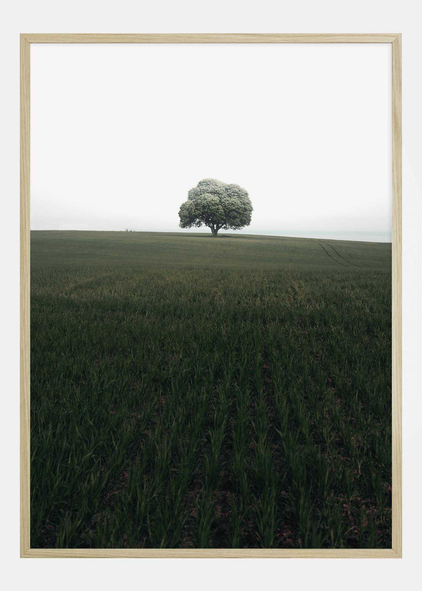 Denne posters presenterer en ensom eik som reiser seg ut av en frodig åker, med en myk tåke som sveiper over landskapet. Treet majestetiske form står som en naturlig skulptur mot det myke lyset, noe som gir en sterk visuell kontrast mot de lineære mønstrene av avlingene i forgrunnen. Den overordnede grønne tonen er komplementert med innslag av varm brun og subtile røde toner, noe som legger til dybde og kompleksitet i bildet.