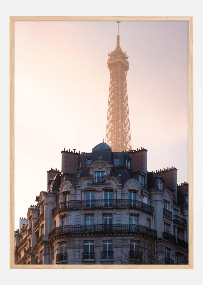 Denne plakaten fanger essensen av Paris med sin romantiske og fortryllende skildring av Eiffeltårnet som sjenert titter frem bak klassiske parisbygninger i Haussmann-stil. Den varme tonen fra solnedgangen gir en myk bakgrunn, der himmelens pastellfarger gir en følelse av drømmende ro. De naturlige fargene i dette trykket gir en følelse av eleganse og enkelhet og gjør det til et perfekt tillegg til hvert rom som trenger en subtil touch av verdens kultur.