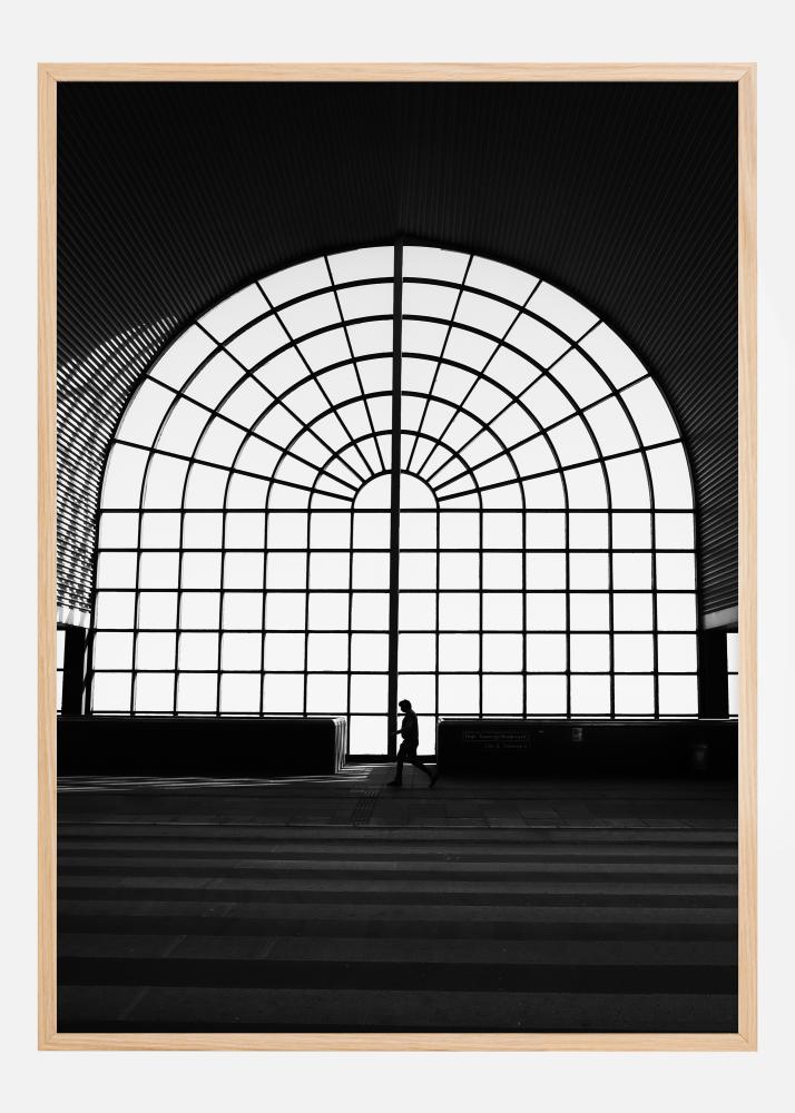Verket med tittelen "Time to Travel" fremstiller en ensom figur som krysser en bred og imponerende arkade, som er tydelig fremhevet av dens symmetri og repeterende mønstre. Det storslåtte, kurvede vinduet slipper inn lys og skaper et dramatisk mønster av skygger og lys på gulvet, noe som forsterker den ensomme vandrerens silhuett. Dette bildet kan vekke tanker om reiser, overganger og de øyeblikkene i livet når vi passerer gjennom ulike faser på vår egen reise.