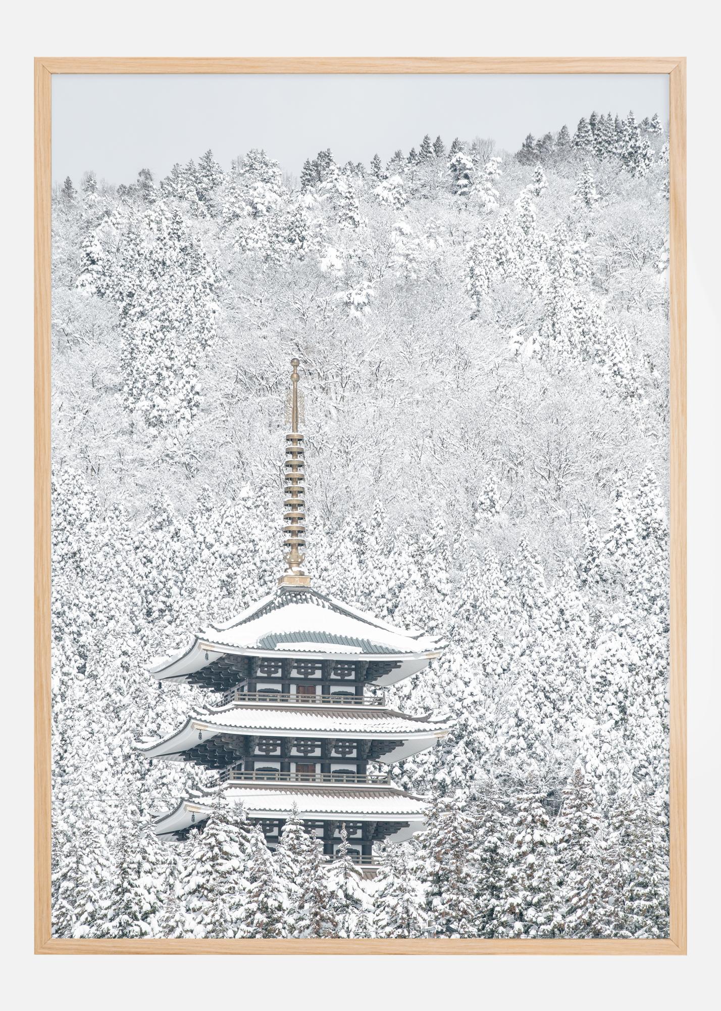 Denne stemningsfulle posteren fremkaller den fredfulle følelsen av et vinterkledd landskap, der en tradisjonell østasiatisk pagodebygning står majestetisk omgitt av et hav av snøtunge trær. Den subtile kontrasten mellom den delikate arkitekturen og de kraftfulle, frodige trærne, alle innhyllet i et tykt lag av snø, skaper et bilde av stillhet og isolasjon. Denne printen fanger perfekt den ensomme skjønnheten i vinternaturen, der nyansene av hvitt varierer fra sterkt, strålende lys til myke, dempede toner.