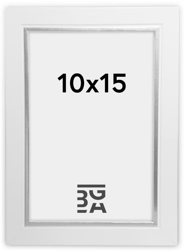 Stilren hvit fotoramme av tre med en liten ekstra "twist" i form av en fin sølvfarget kant nærmest motivet. En perfekt ramme til portrettbilder.
