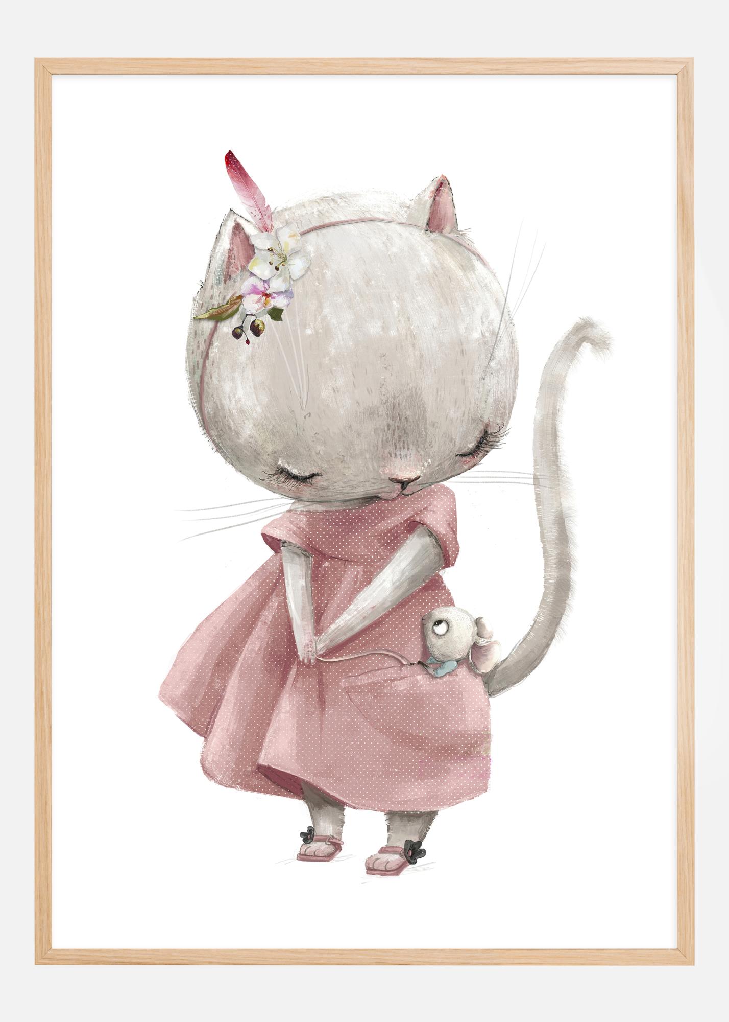 Denne bedårende plakaten viser en søt scene av et uvanlig vennskap; en liten mus som hviler trygt i kattens fang, begge kledd i festlige klær. Katten er fint kledd i en rosa kjole, komplett med en elegant blomsterdekorasjon på hodet. Den fine akvarellmaleriet gir dyrene en mykhet og varme som utstråler vennskap og tillit.