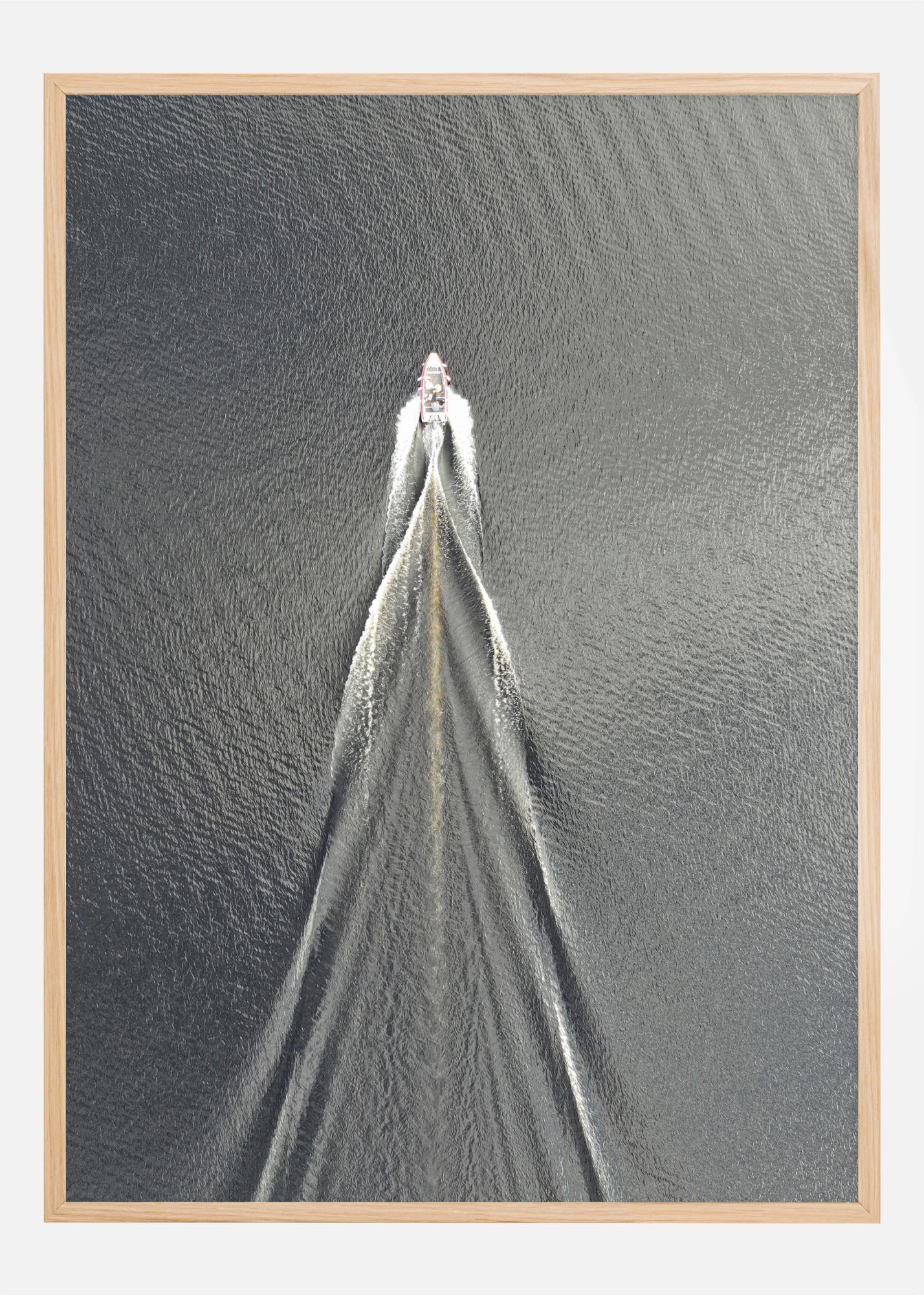 Posteren "Usain Boat" fanger essensen av hastighet og frihet. En kraftig motorbåt skjærer gjennom det rolige vannet, etterlater et imponerende kjølvann som et tydelig spor av dens hastighet. Kontrasten mellom det mørke, nesten teksturerte vannet og det hvite skummet skaper en visuell dynamikk som er både beroligende og oppkvikkende.
