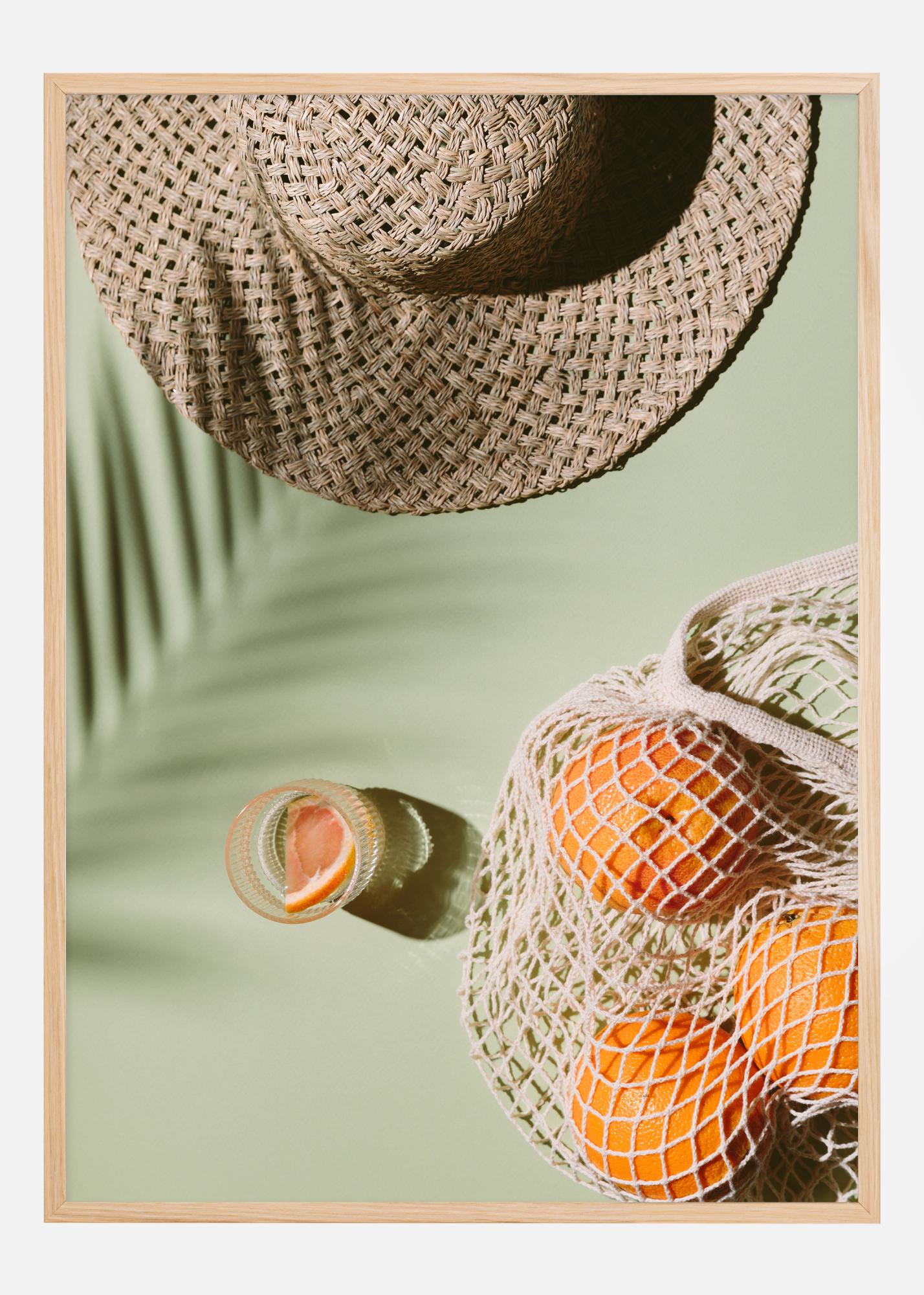 De varme tonene av appelsin og de naturlige nyansene i hatten skaper en perfekt kontrast mot den milde grønne bakgrunnen, noe som gir et inntrykk av letthet og naturlig skjønnhet. Denne plakaten er ikke bare en dekorasjon; den er en påminnelse om de enkle gledene i livet, som å nyte frisk frukt eller kjenne solen mot huden. Det er den perfekte innredningsdetaljen for å skape en avslappet atmosfære på kjøkkenet, på terrassen eller i hvilket som helst sted som trenger et solfylt preg.
