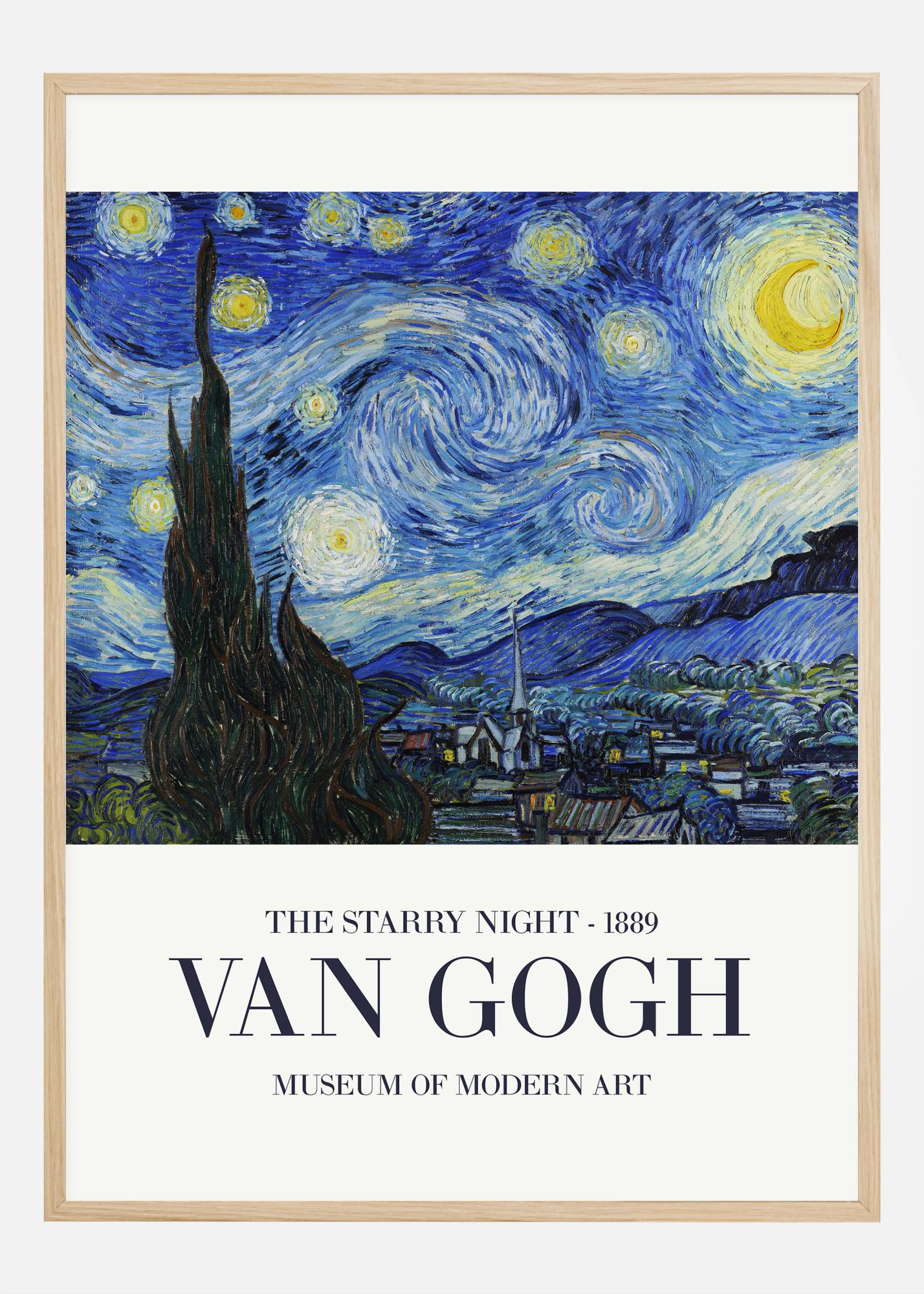 Dette er en plakat som avbilder Vincent van Goghs tidløse mesterverk "The Starry Night", skapt i 1889. Verket er berømt for sin dynamiske og emosjonelle fremstilling av den stjerneklare natten over den lille landsbyen Saint-Rémy. Med sin virvlende himmel av blått og gult og den karakteristiske sypressen som strekker seg opp mot nattehimmelen, fanger van Gogh en følelse av bevegelse som fortsatt er gripende over et århundre senere.