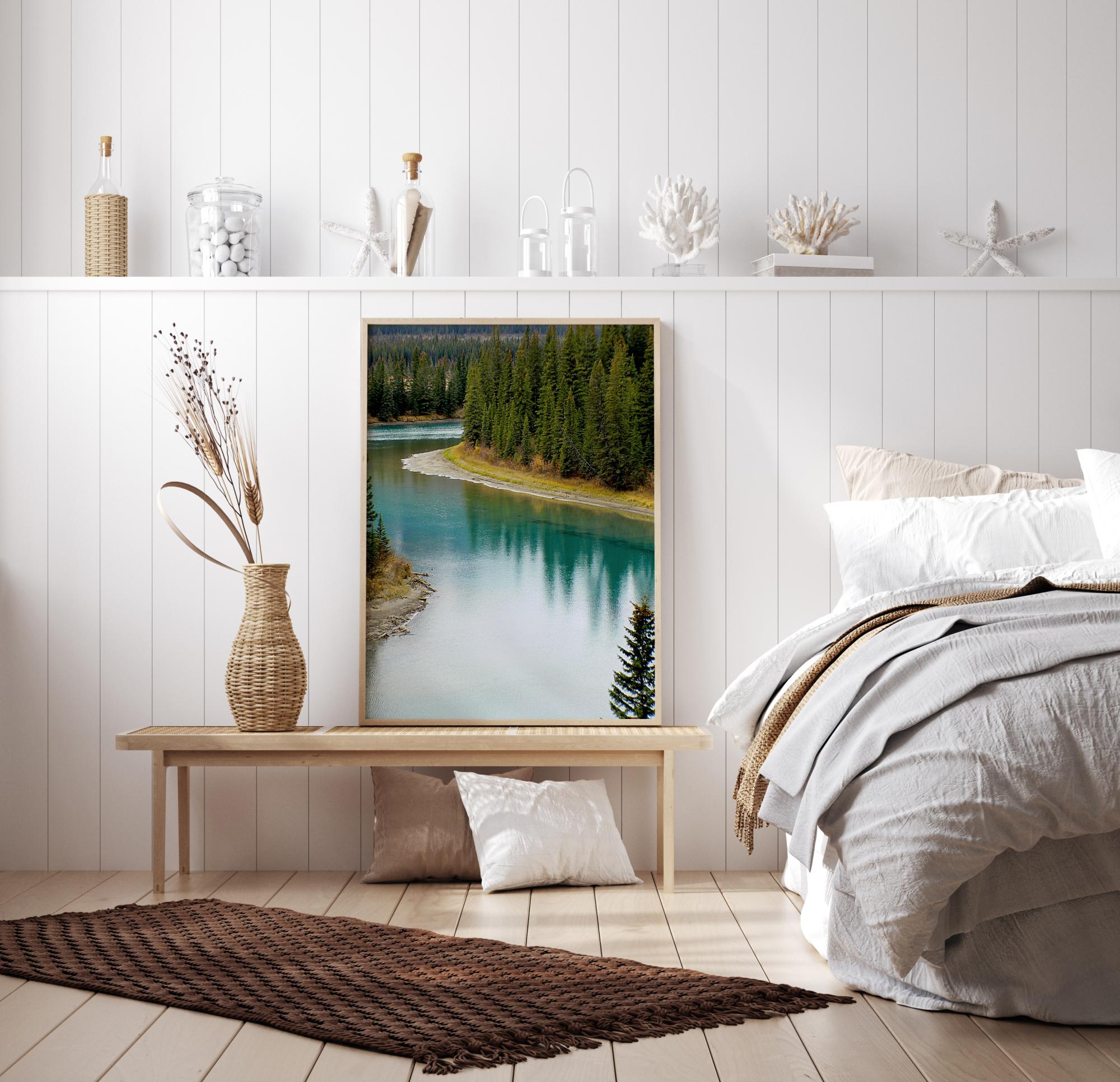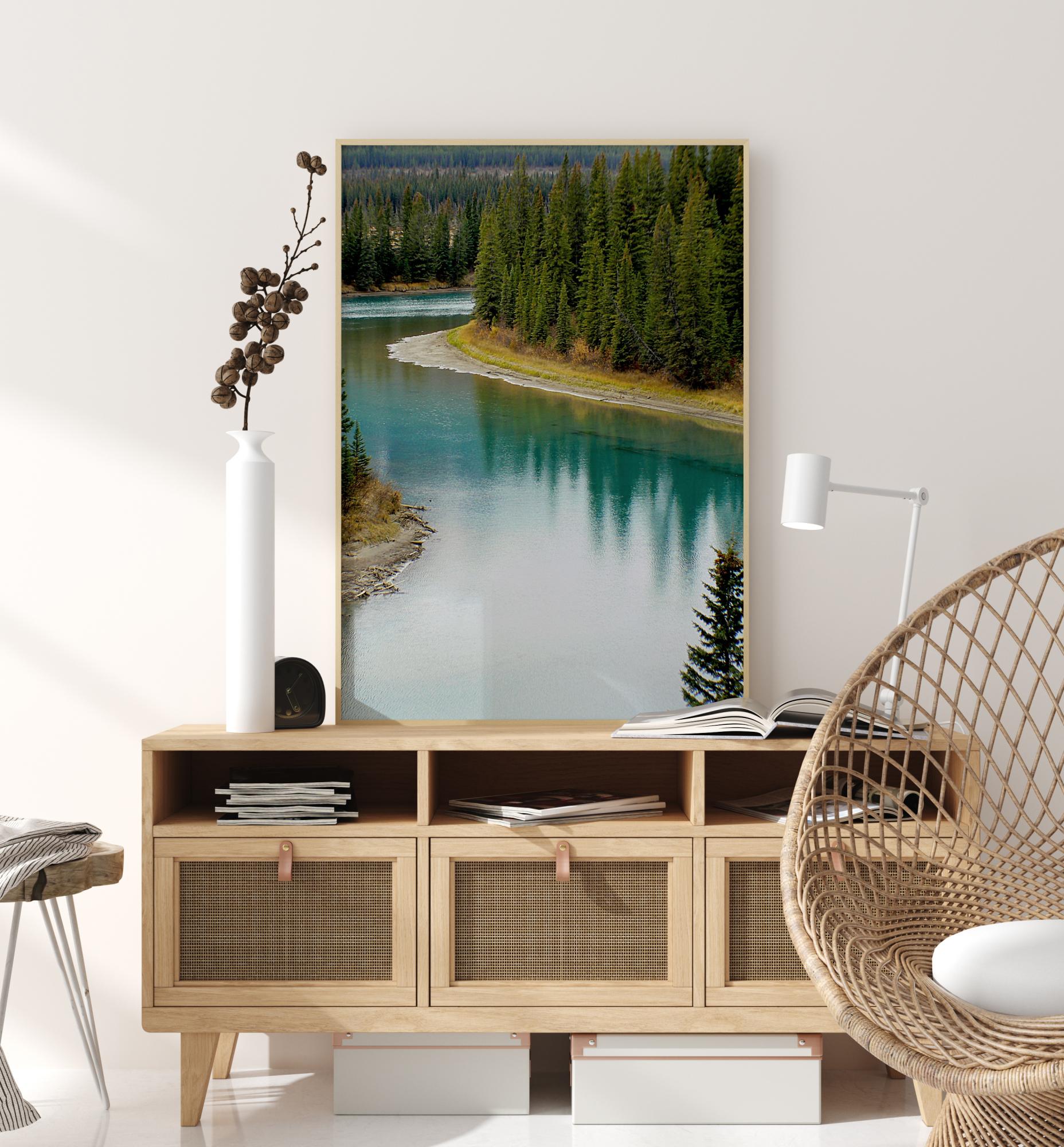 En skogsplakat med grantrær som markerer bredden av en bred elv som kurver seg gjennom landsbygda. De grønne trærne strekker seg høyt, og skogen strekker seg ut i det fjerne. Den brede elven har en nesten regnbuefarget tone, og fanger de høye spisse refleksjonene av trærne på overflaten.