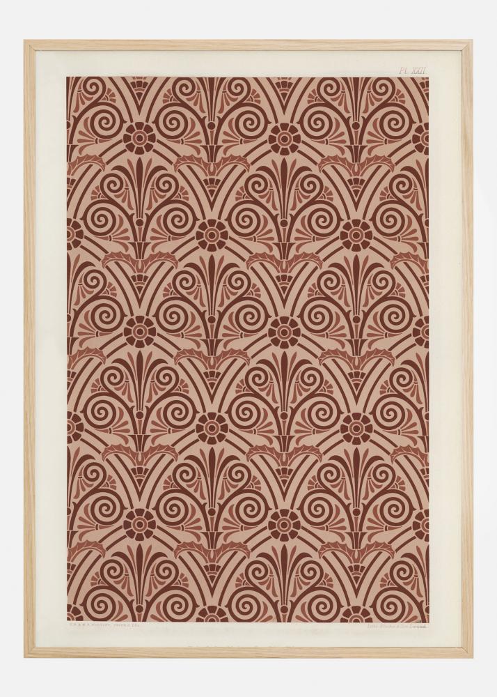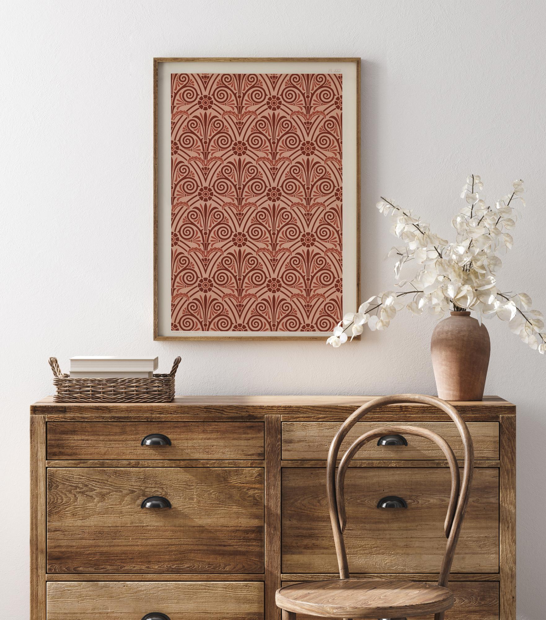 En sterk mønstret plakat av røde gjentatte mønstre. Innenfor mønstrene ser krøllende sirkler ut som blader. Det er også intervaller med blomsterformer, som gjør dette til et botanisk trykkmønster. Perfekt for å lage tapet; se hvilke bilder du ser i disse intrikate mønstrene.