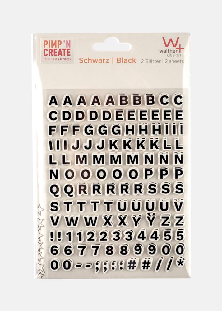 Bokstavene er 1 cm store og har et stilrent design i svart. Pakken inneholder 2 ark med 126 bokstaver, tall og spesialtegn.