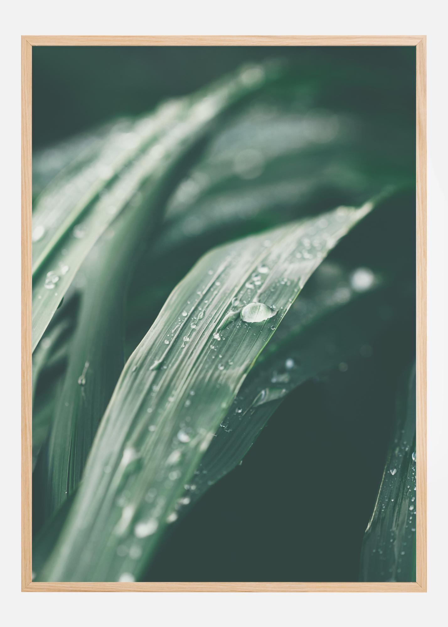 En makroplakat med blader med vanndråper på. De mørkegrønne bladene fyller bildet med årene sine vist i skarp detalj. Vanndråper følger bladenes kurver som drypper ned mot kantene på bildet. Heng denne plakaten på en myk jordfarget vegg for en behagelig skogsfølelse.