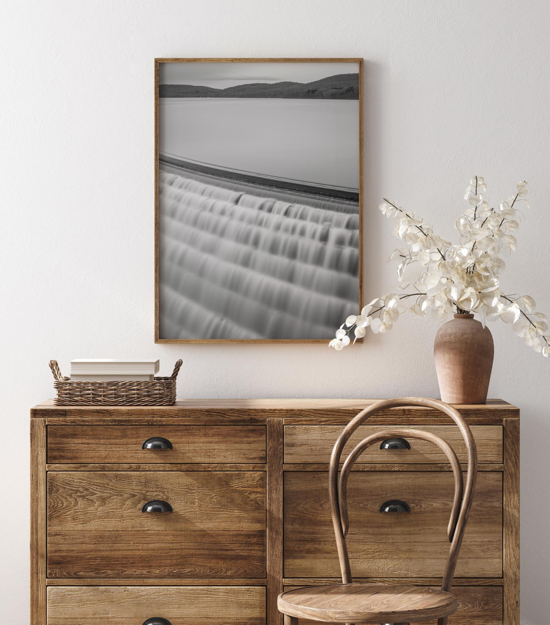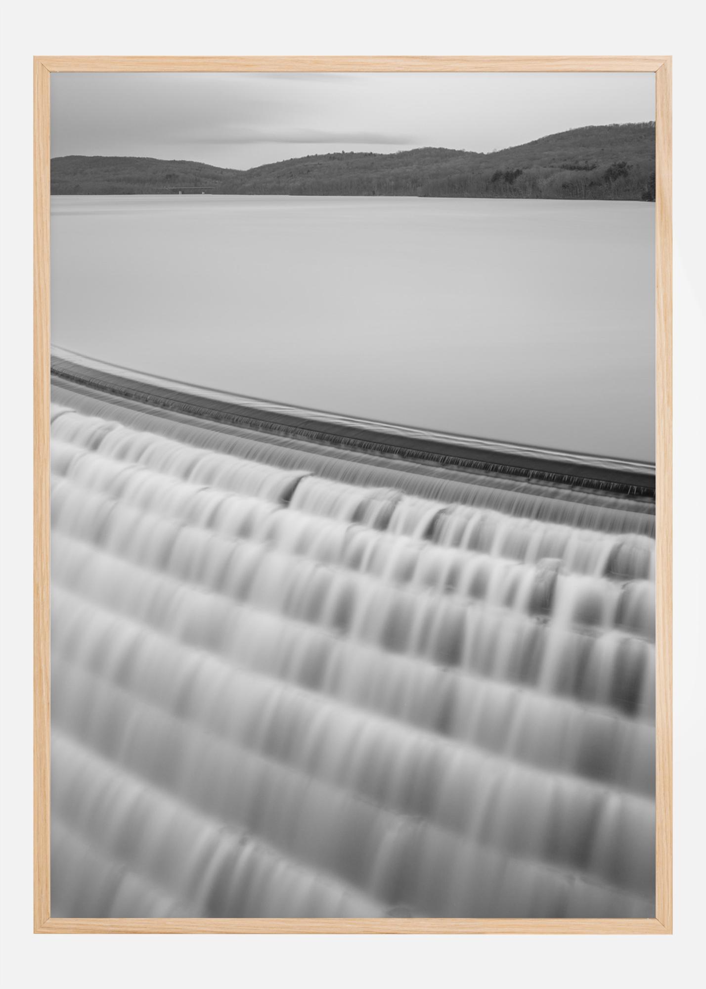En grå plakat med små fosser som strømmer over en menneskeskapt dam av en innsjø. Det stille grå vannet strekker seg ut med de små fossene som strømmer over de små hyllene, og skaper et mønster som beveger seg raskt. Slapp av og la blikket følge vannstrømmene mens de flommer ned.