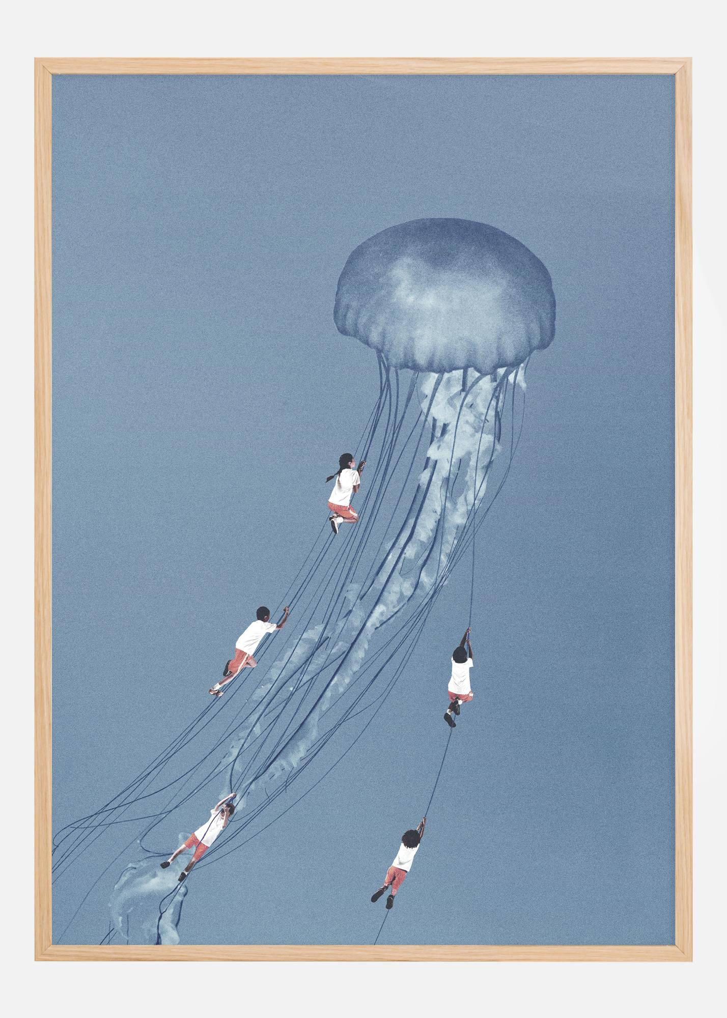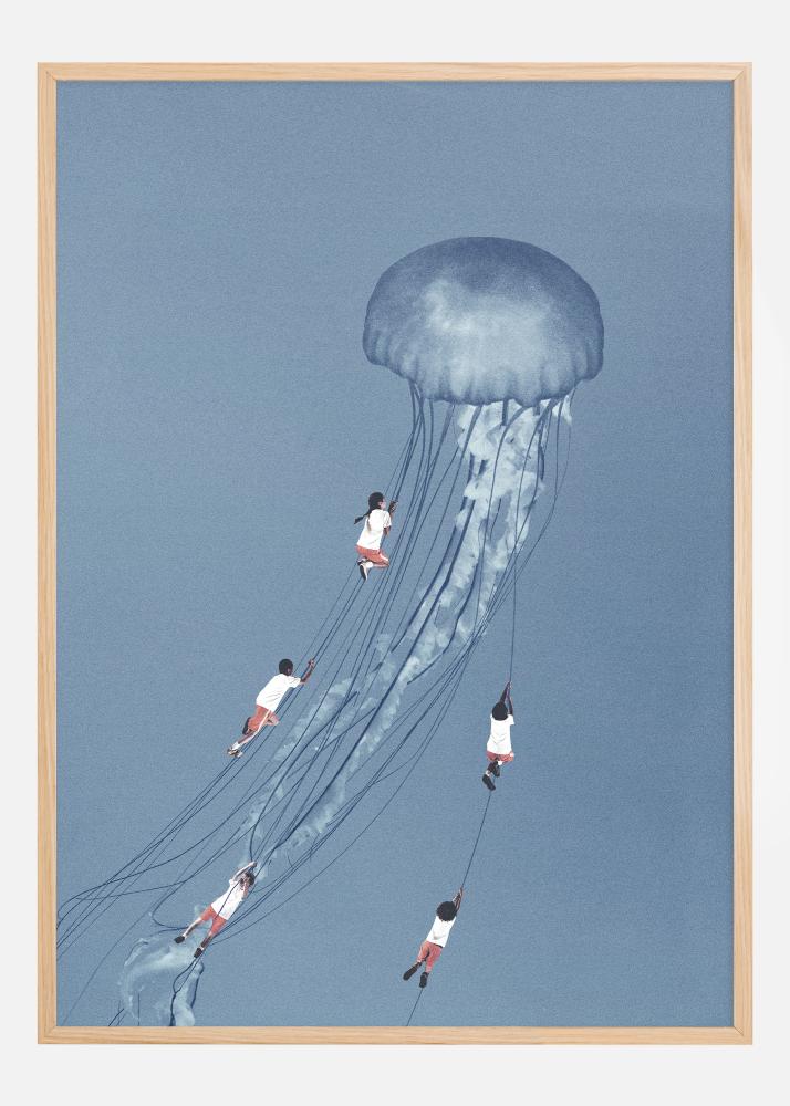 Denne poetiske og drømmelignende plakaten viser mennesker som husker på tentaklene til en gigantisk manet, svevende i en uendelig blå himmel. Denne fascinerende scenen er en hyllest til fantasikraften, der det underbevisste og drømmeverdenen kolliderer med den våkne virkeligheten. Personenes vektløse dans med maneten symboliserer glede, frihet og den ubesværede letthet som ofte finnes i barns lekne verdener.