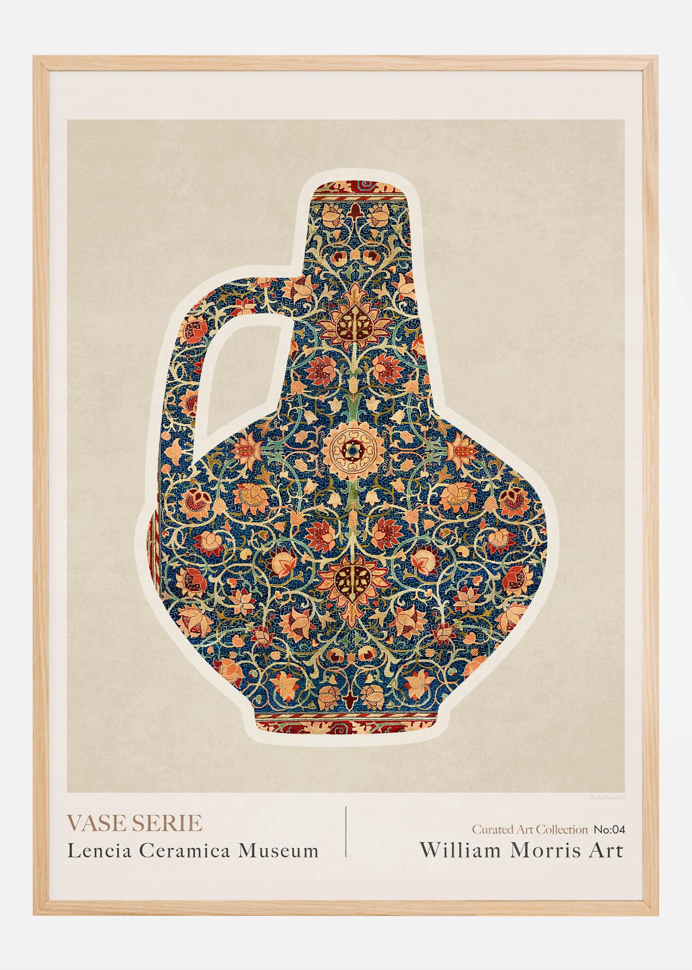 Denne plakaten, som er nummer 04 i "Curated Art Collection" fra Lencia Ceramica Museum, er en rik og kompleks hyllest til William Morris og hans betydelige bidrag til mønsterkunsten. Her presenteres en stilfull vase, dekket av et detaljert og fargerikt mønster som utstråler den viktorianske tidens fascinasjon for orientalsk og middelaldersk kunst, en stil som Morris hjalp til å popularisere.