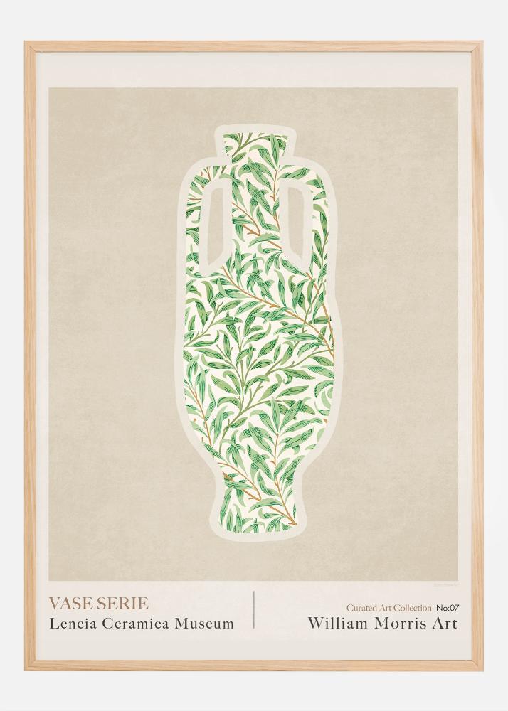 Denne delikate og naturinspirerte posteren er nummer 07 i vår "Curated Art Collection" fra Lencia Ceramica Museum, som feirer William Morris' kunstneriske arv. Den framstiller en klassisk vasesilhuett, fylt med et av Morris' distinkte grønne plantemønstre, hvilket viser hans mesterlige måte å kombinere form og funksjon med estetisk skjønnhet i design. Det er en tidløs hyllest til Morris' visjon og hans evne til å ta inspirasjon fra naturen og omforme den til kunst.
