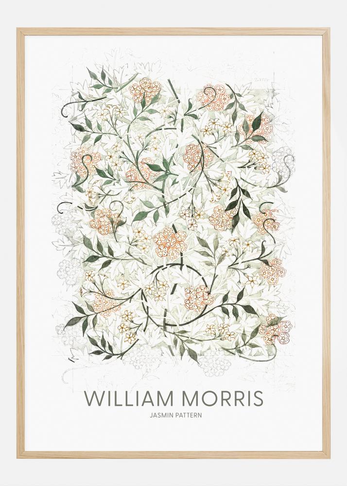Denne utsøkte posteren presenterer "Jasmin Pattern", enda et tidløst verk av den berømte designeren William Morris. Mønsteret er en herlig komposisjon av jasminblomster og bladverk, framstilt med en finesse og en oppmerksomhet på detaljer som er karakteristisk for Morris. Fargeskjemaet er en myk og naturlig palett, som fremhever blomstenes delikate former og bladene mot en rolig bakgrunn.
