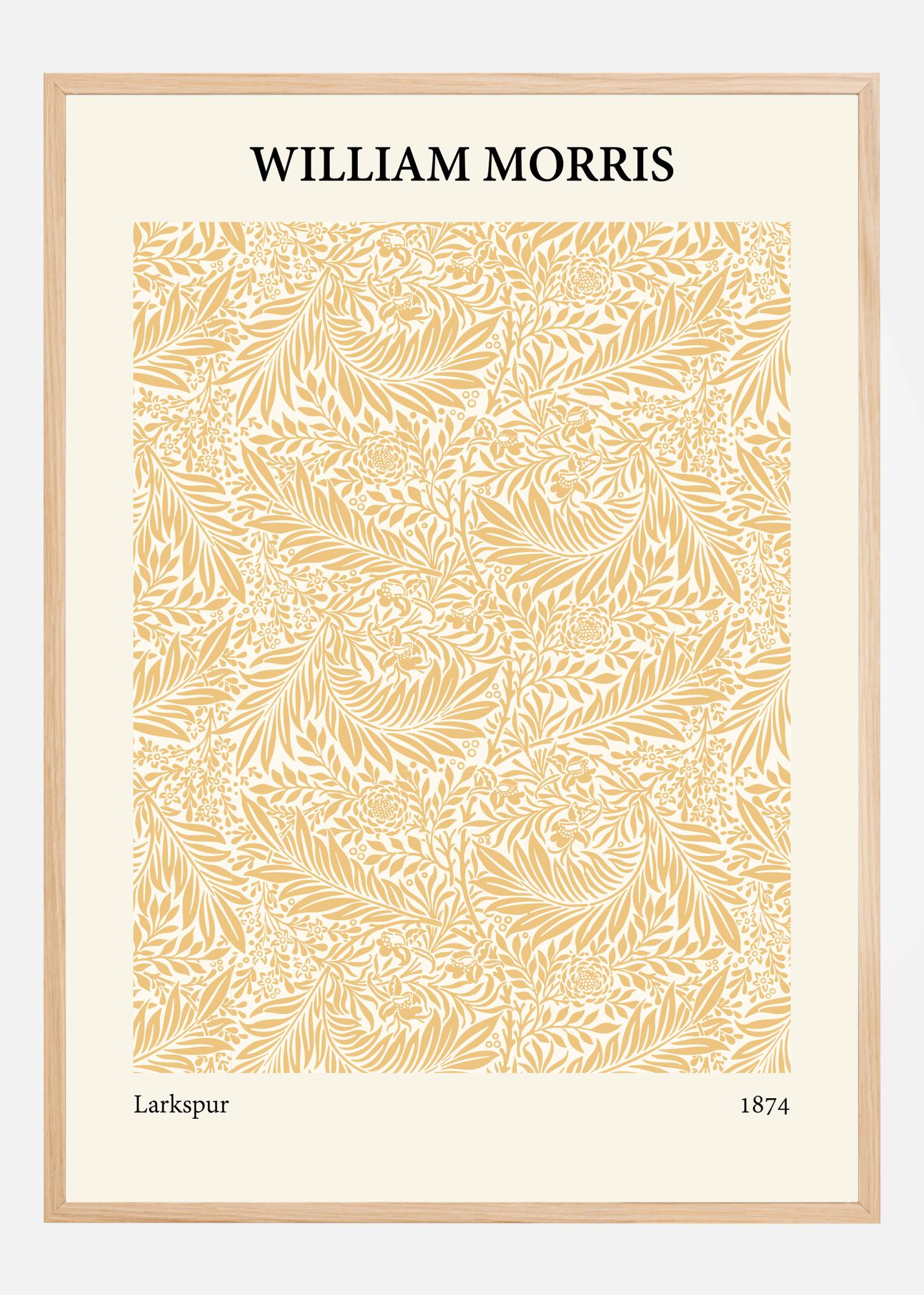 Med sin varme, monokromatiske gulltone, gjenskaper denne plakaten den overdådige designen av William Morris' "Larkspur" fra 1874. Den rike komposisjonen av blader og blomster danser over papiret, hvilket illustrerer den dyktigheten og presisjonen som Morris er kjent for innen Arts and Crafts-bevegelsen. Denne posteren gir en følelse av varme og solskinn til ethvert rom og er en fantastisk hyllest til det viktorianske tiders kunsthåndverk.